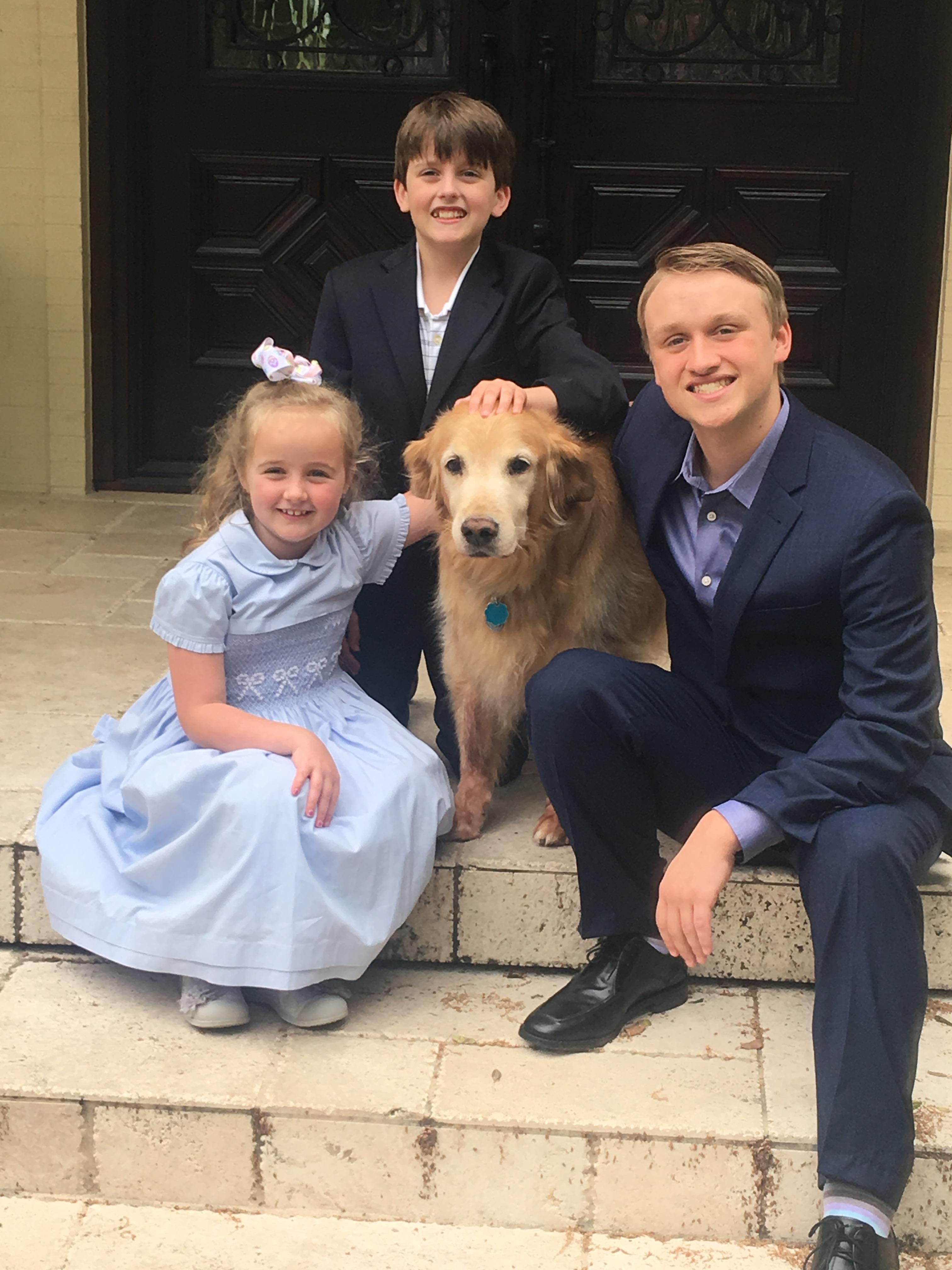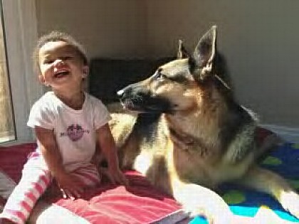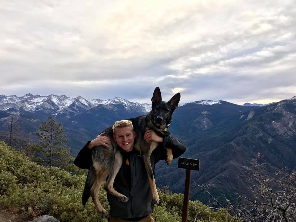 Painting of a man carrying a German Shepherd on his shoulders, mountains in the background.