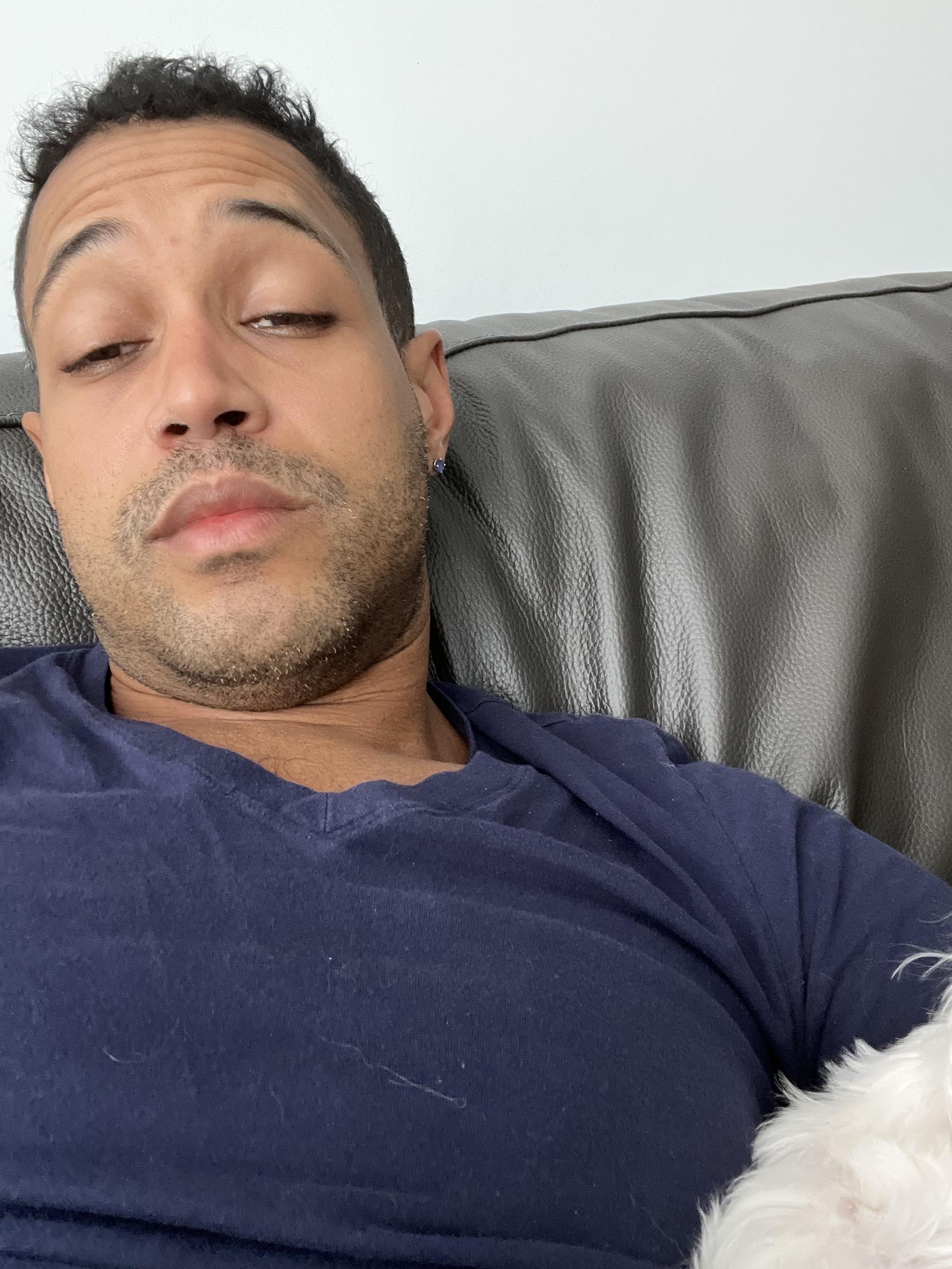 Smiling man holding a small light brown dog.