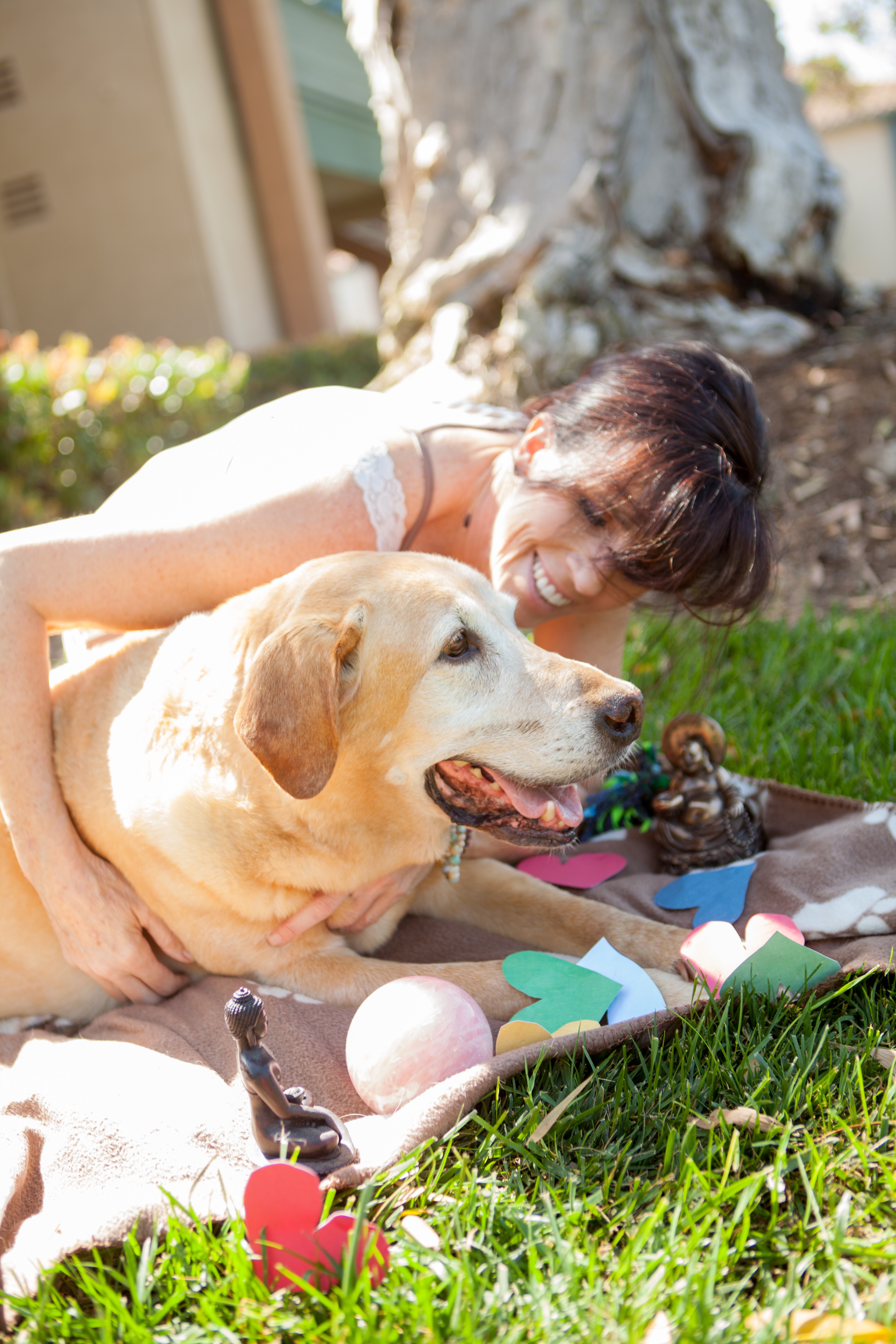 Smiling woman hugging a yellow Labrador Retriever.