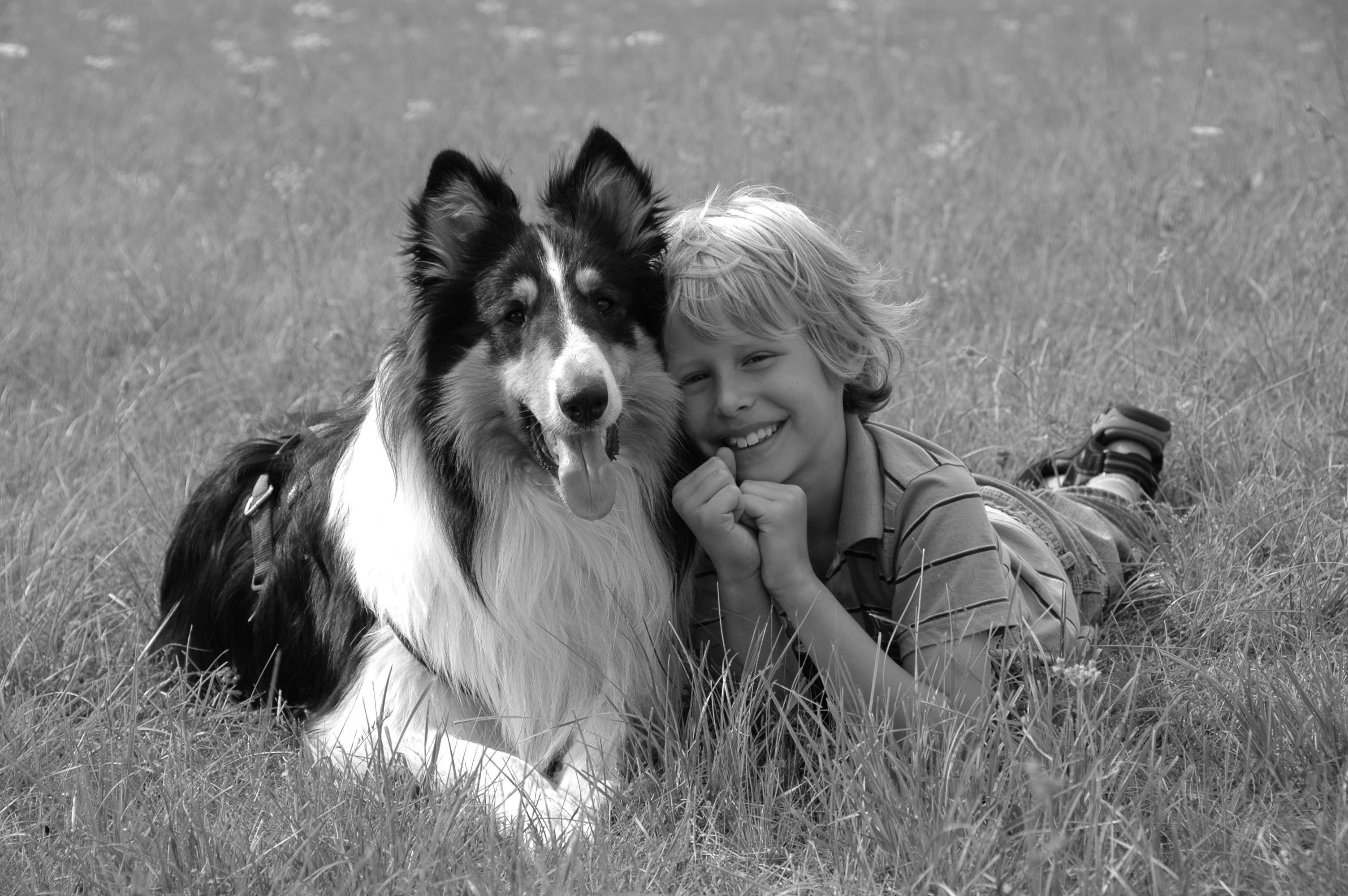 Black and white portrait of a boy and his Collie dog lying in the grass.