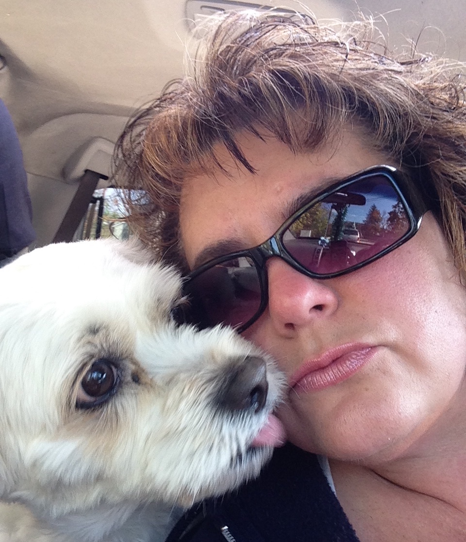 Painting of a woman wearing sunglasses with a small white dog licking her cheek.