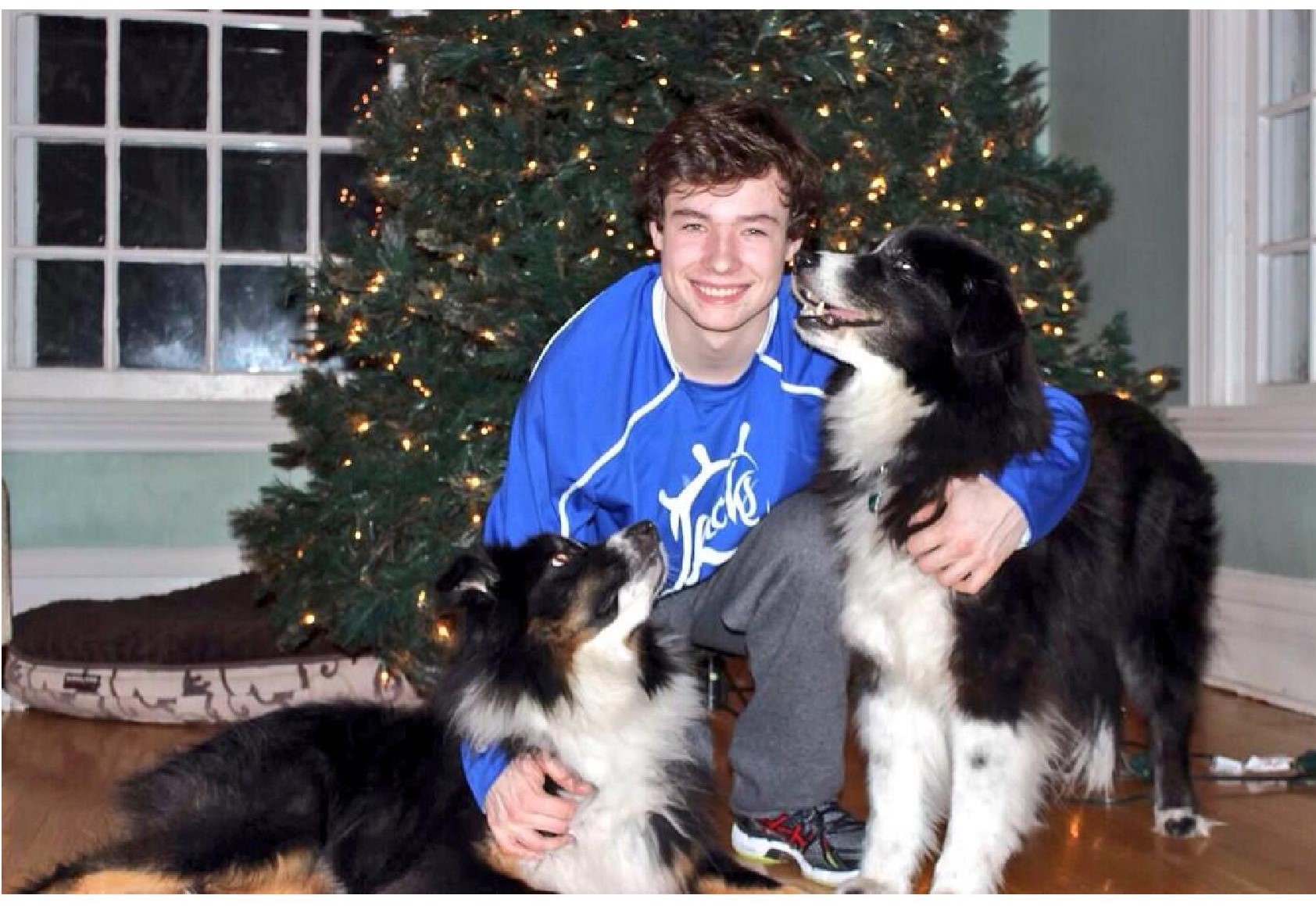 Painting of a boy with two dogs near a Christmas tree.