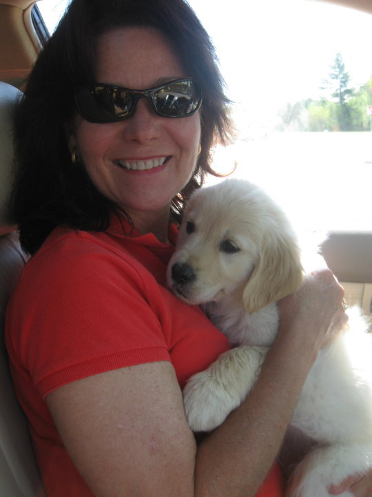 Smiling woman in sunglasses holding a golden retriever puppy.