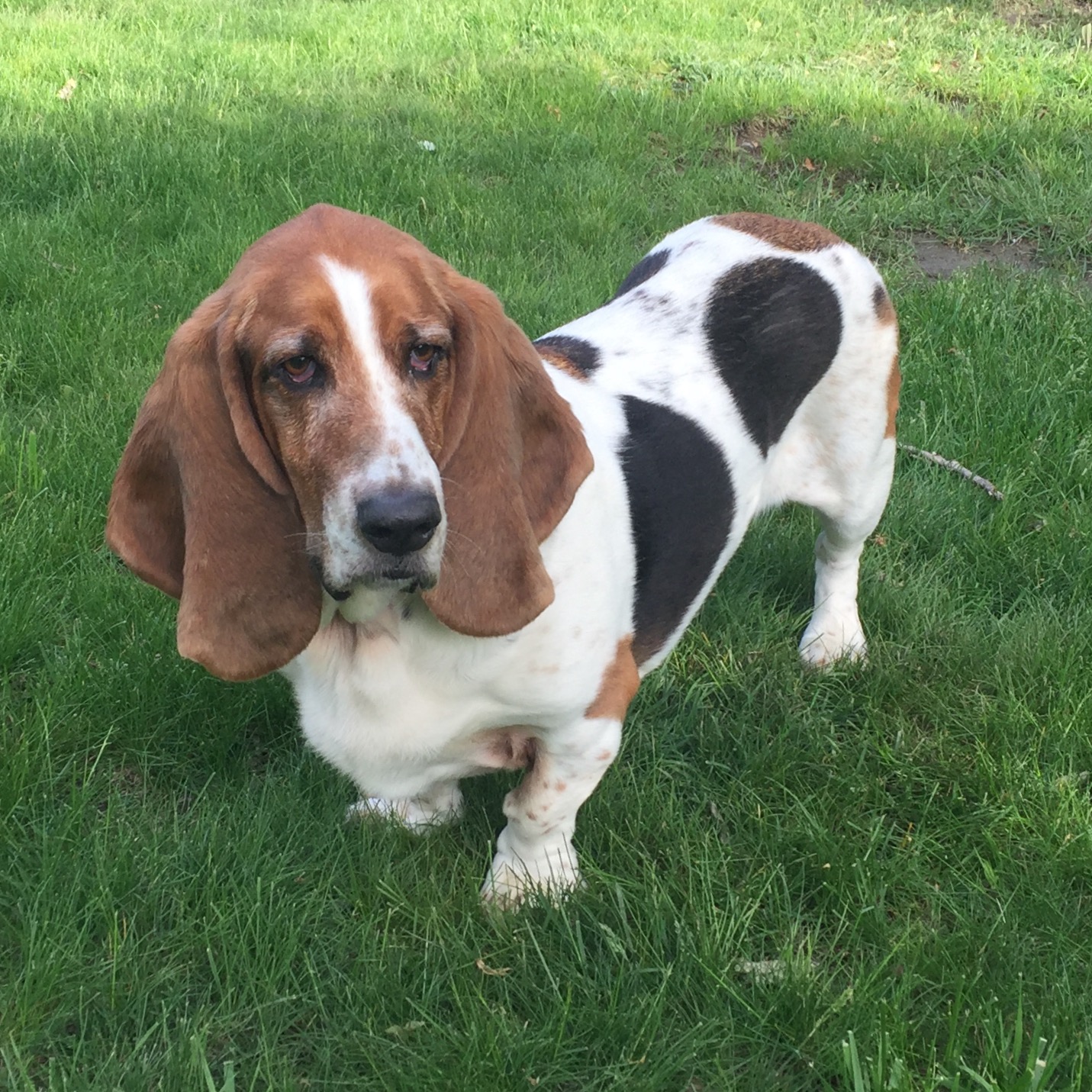 Woman smiling and holding two basset hound puppies.