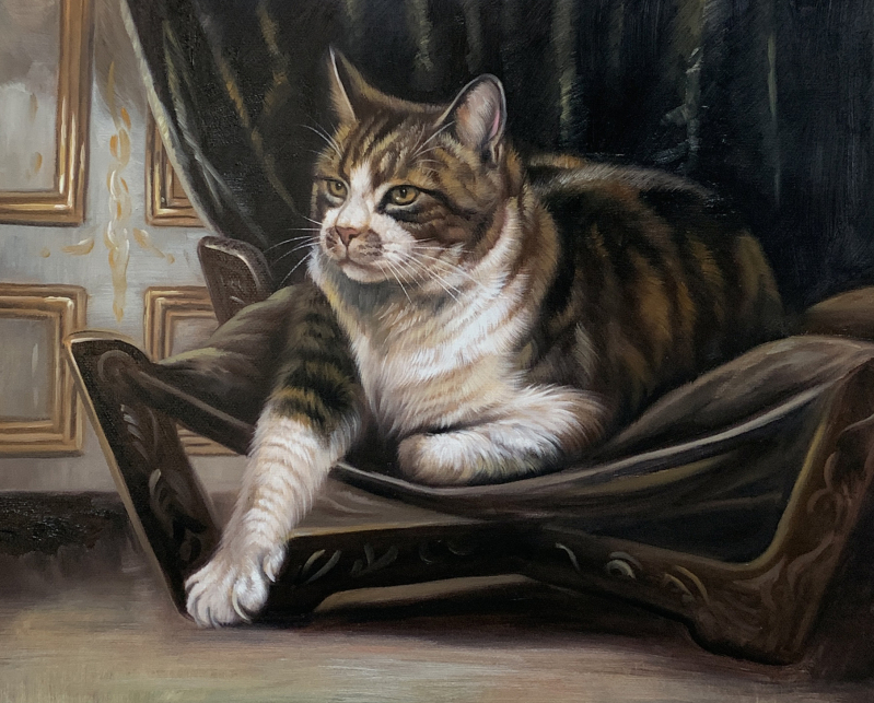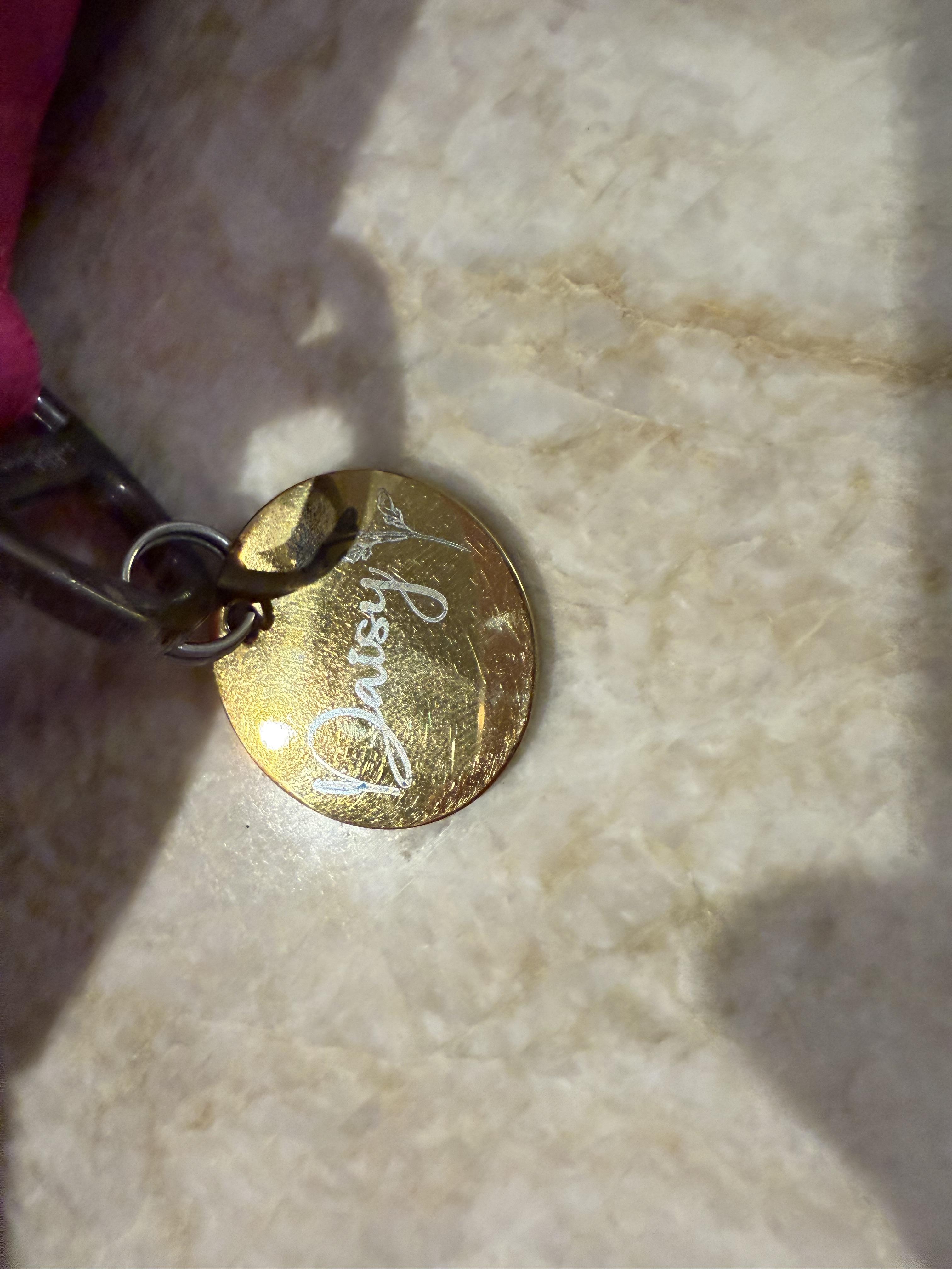 Painting of a happy bulldog named Monty, tongue out, wearing a collar with a tag.