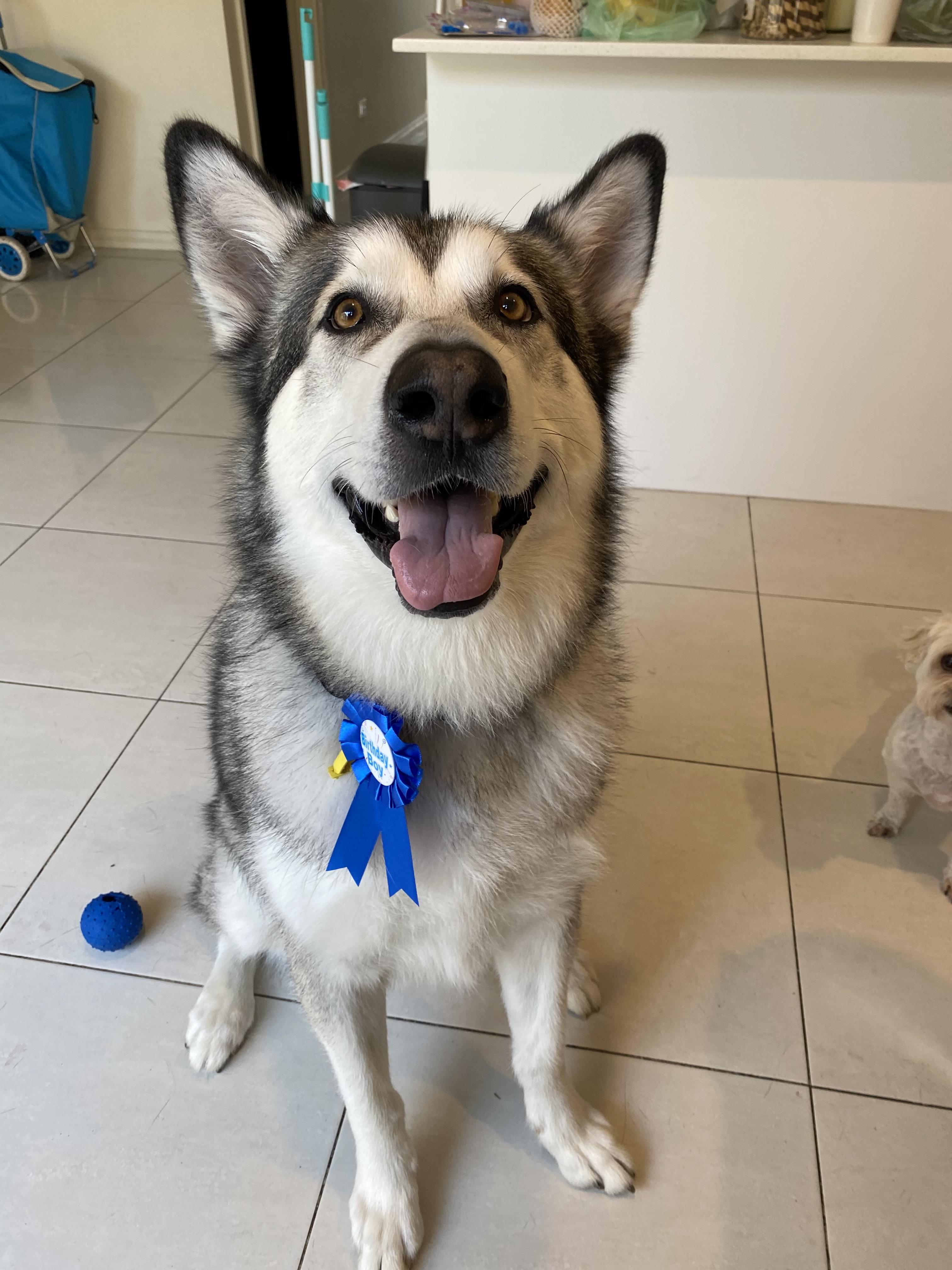Painting of a happy Alaskan Malamute wearing a Birthday Boy ribbon.