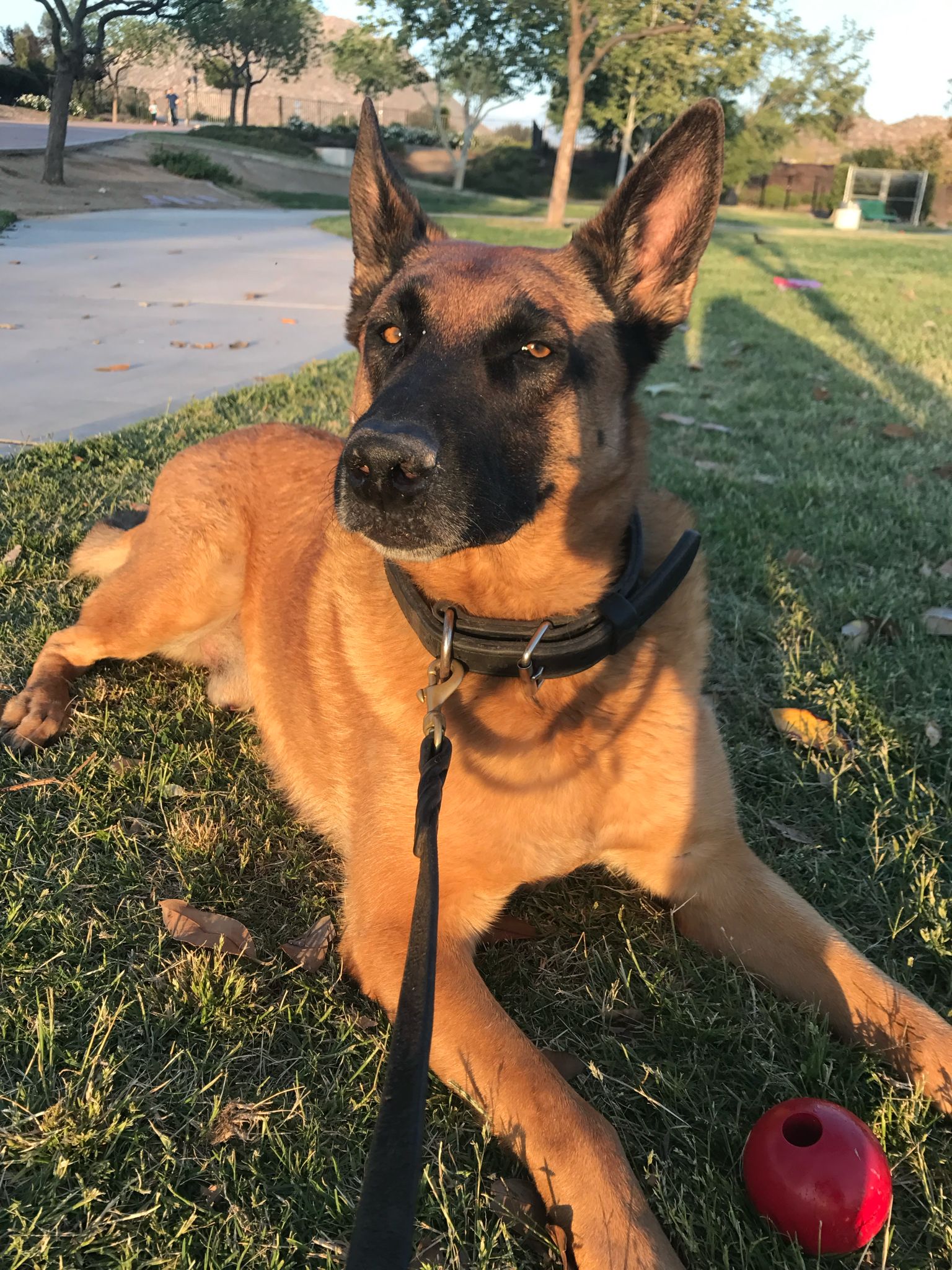Watercolor painting of a Belgian Malinois lying in the grass, wearing a collar, and near a red ball.