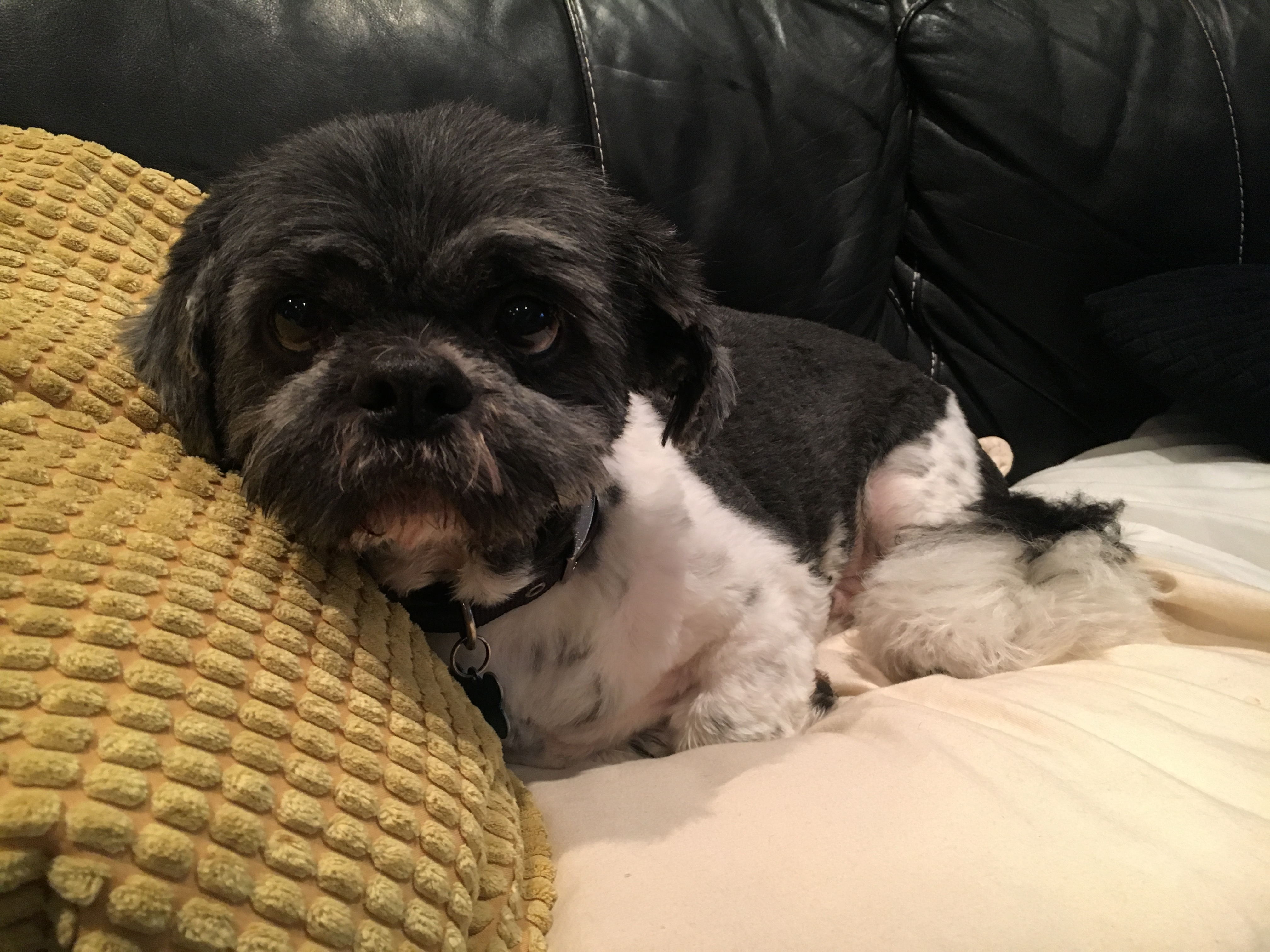 Oil painting of a Shih Tzu dog wrapped in a paw print blanket.