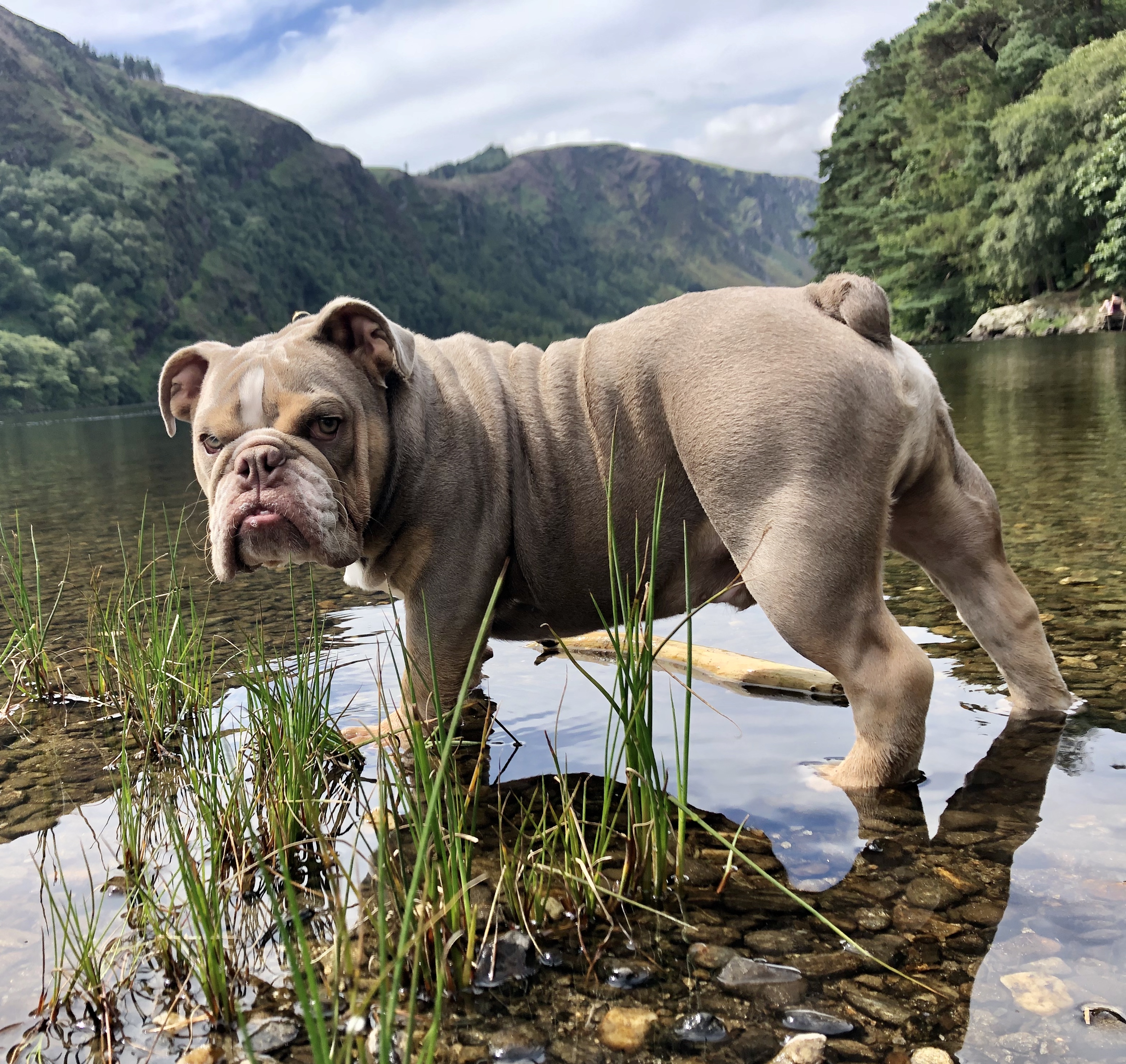 Painting of a light brown bulldog standing in shallow water.