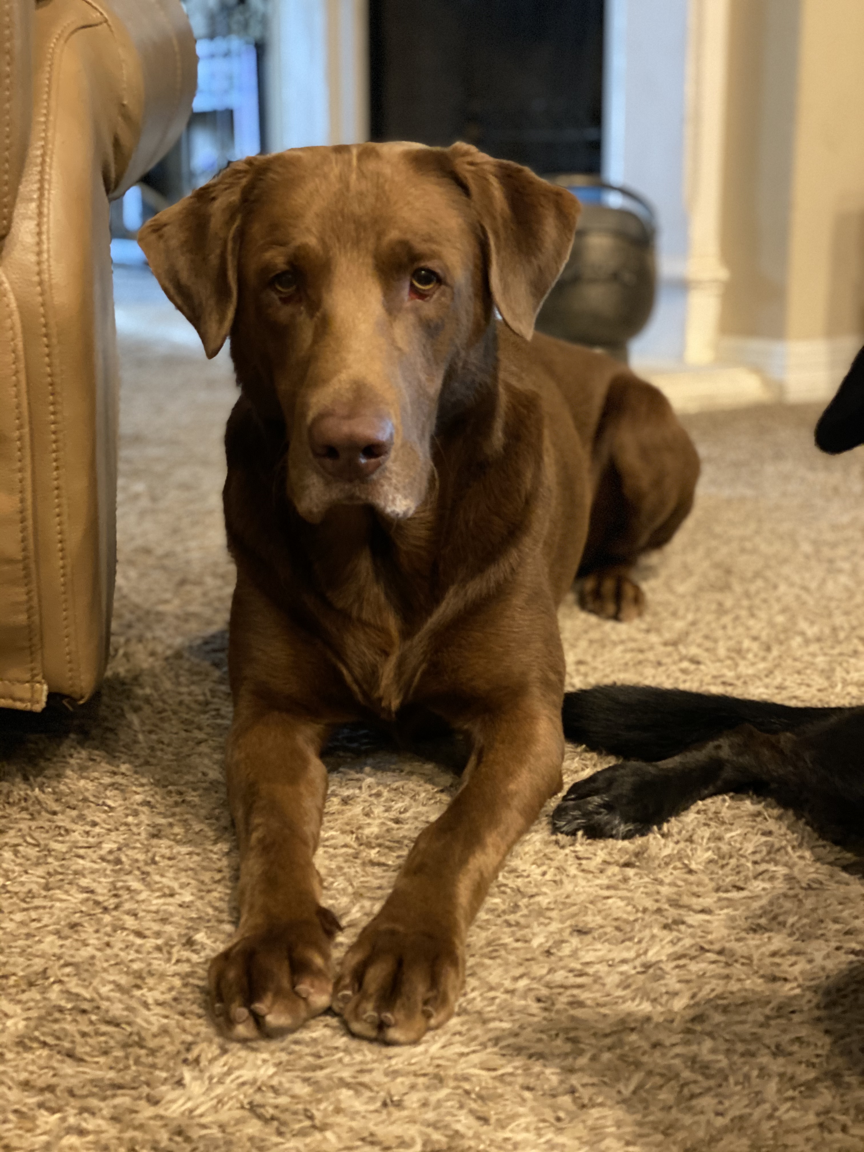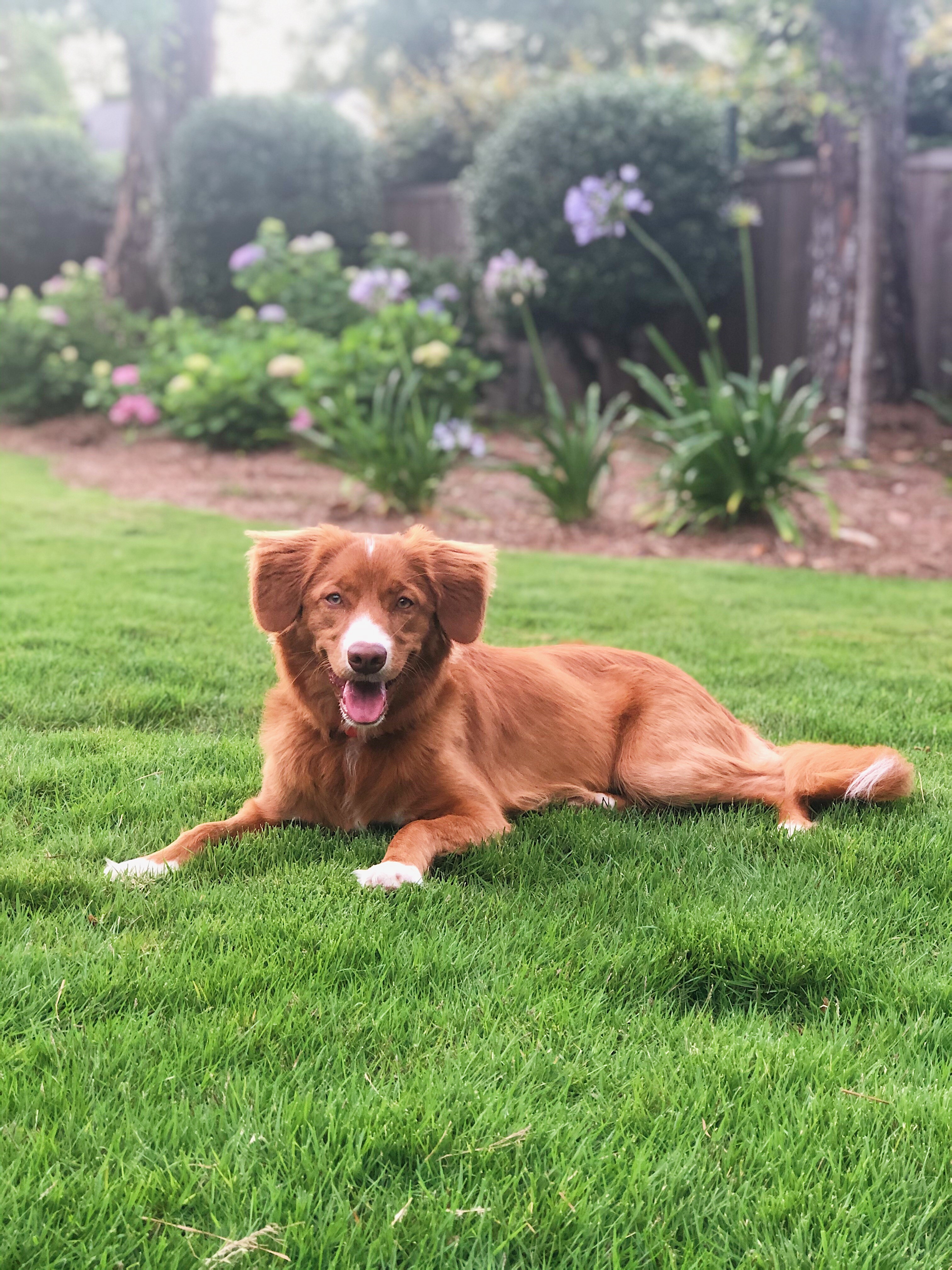 Painting of a Nova Scotia Duck Tolling Retriever lying on green grass in a garden.