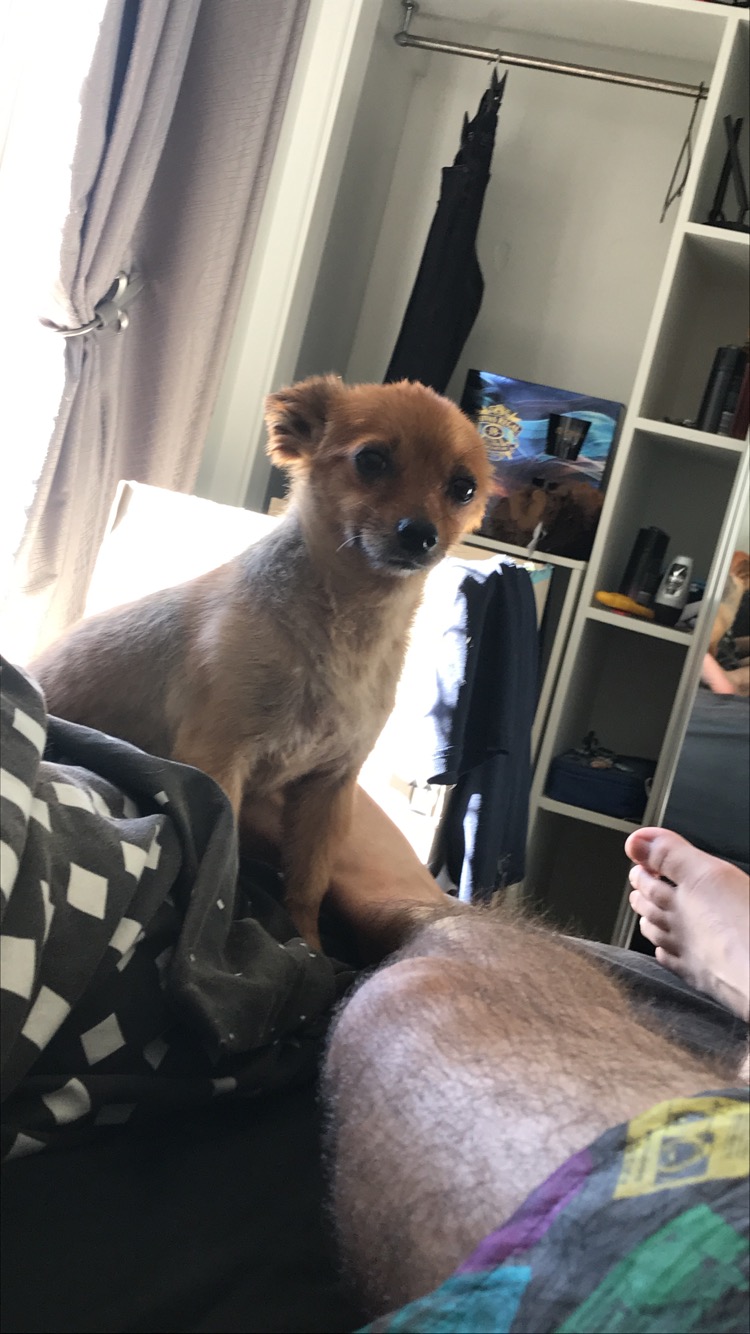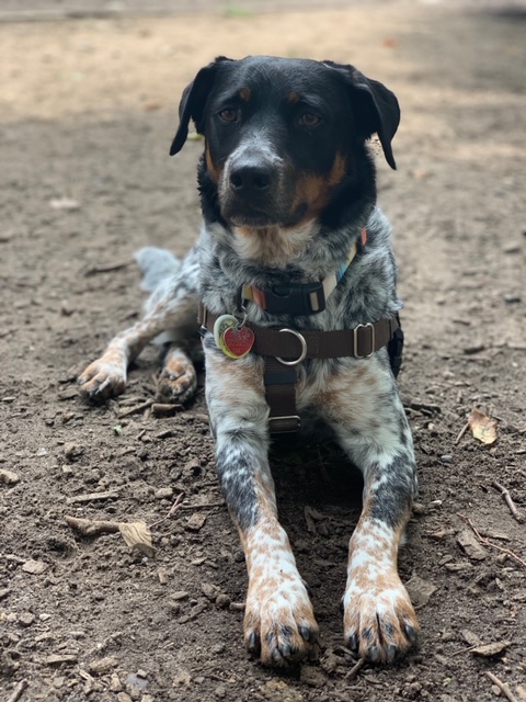Painting of a blue heeler mix dog wearing a harness and tags, lying down.