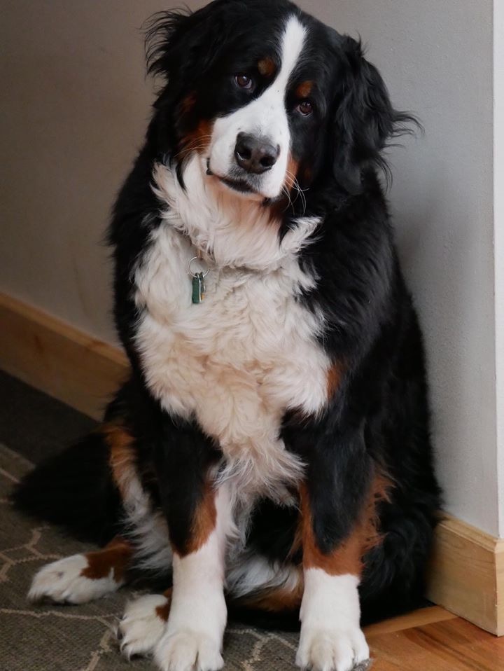 Painting of a Bernese Mountain Dog wearing a collar with a tag.