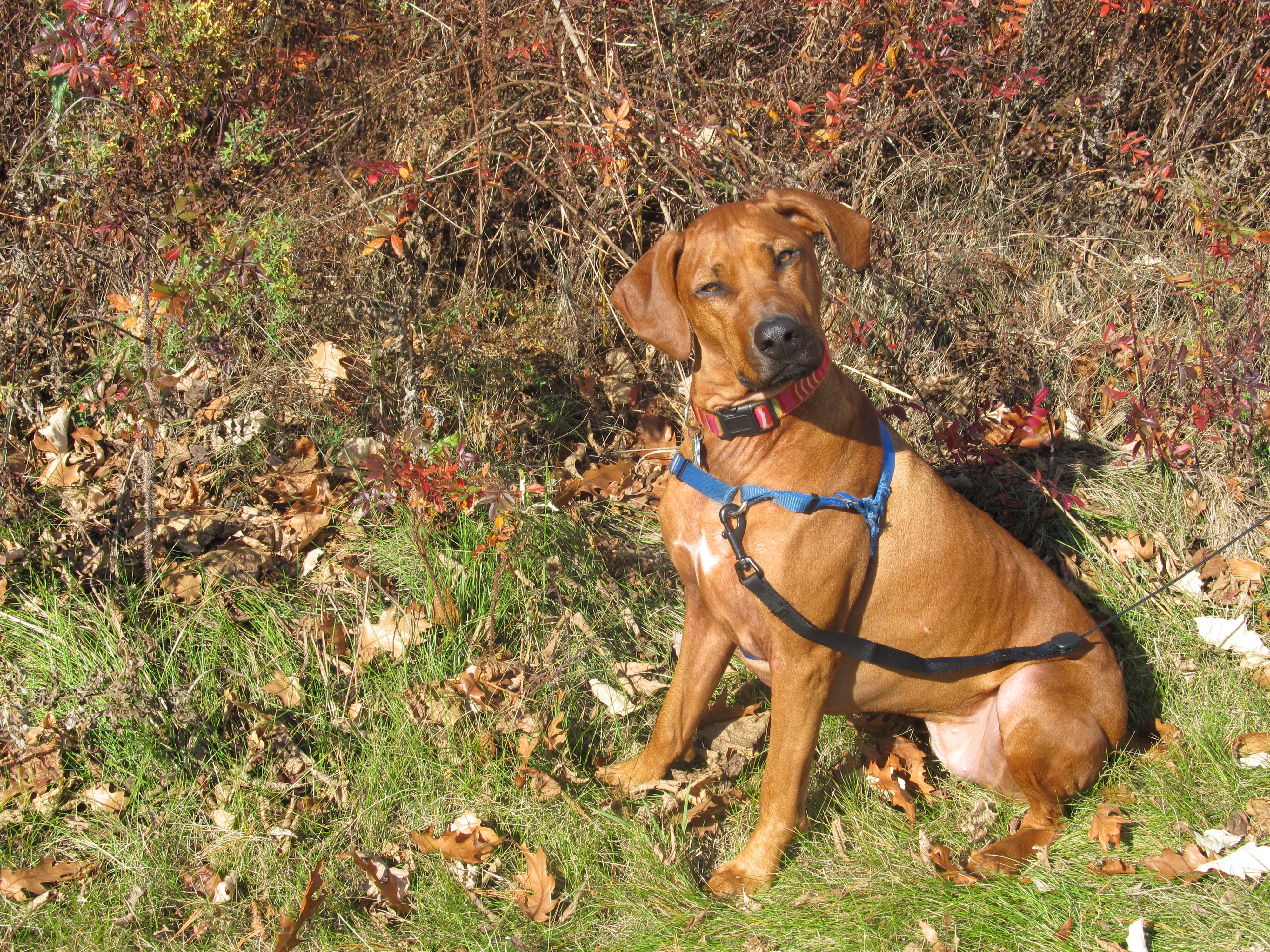 Painting of a Rhodesian Ridgeback sitting in grass.