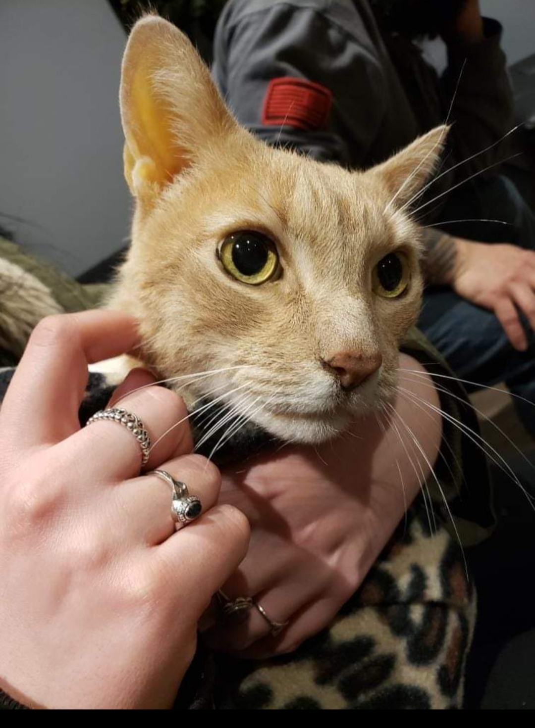 Painting of a longhaired brown tabby cat wearing an orange sweater.