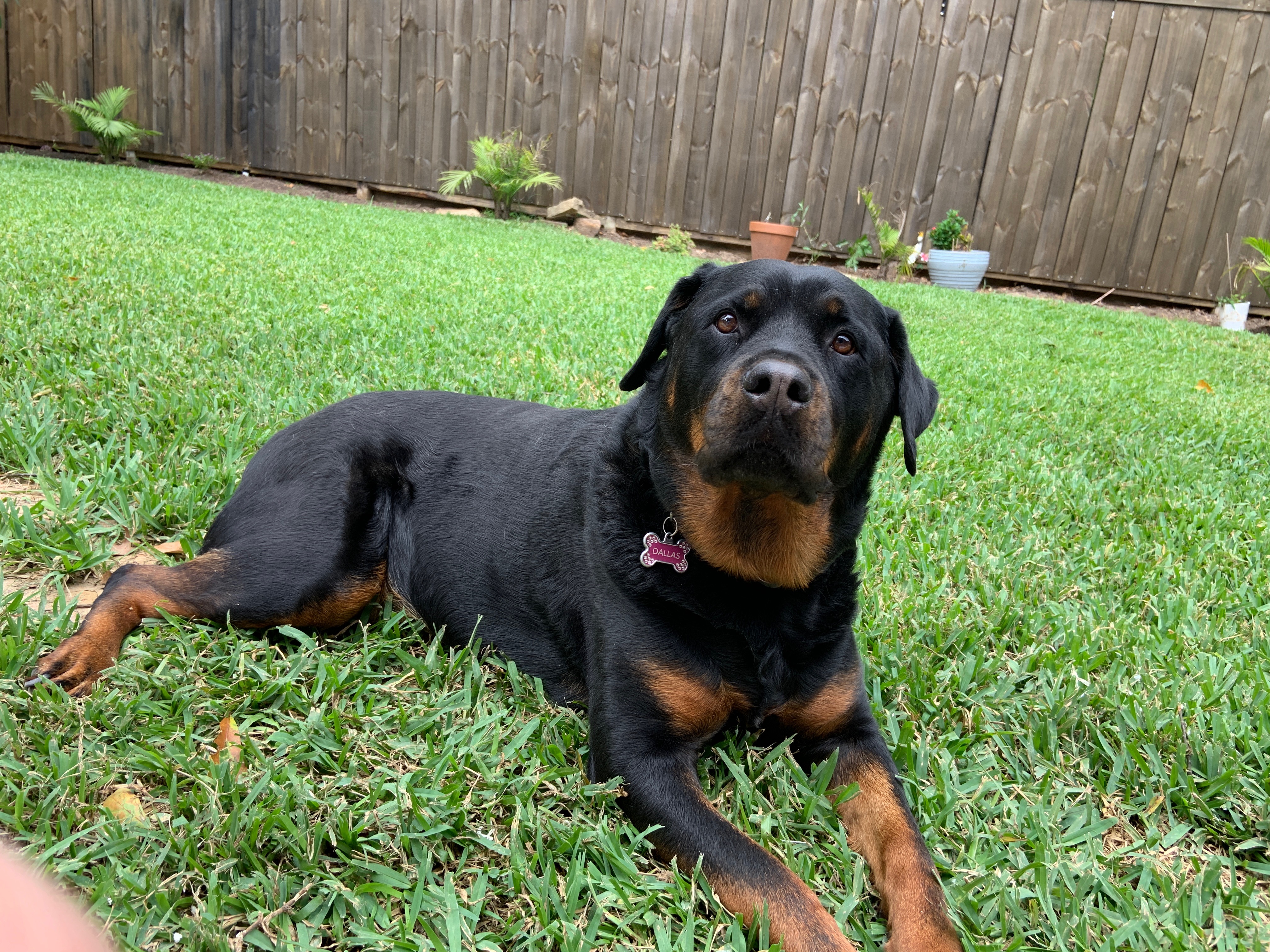 Painting of a black and tan Rottweiler lying in green grass, wearing a collar with a tag that reads DAISY.