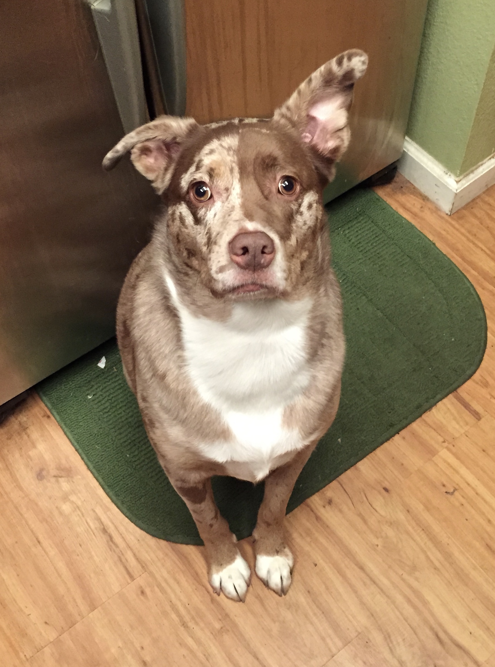 Painting of a Pit Bull terrier mix with blue and brown eyes, titled Fly High, Jakie!