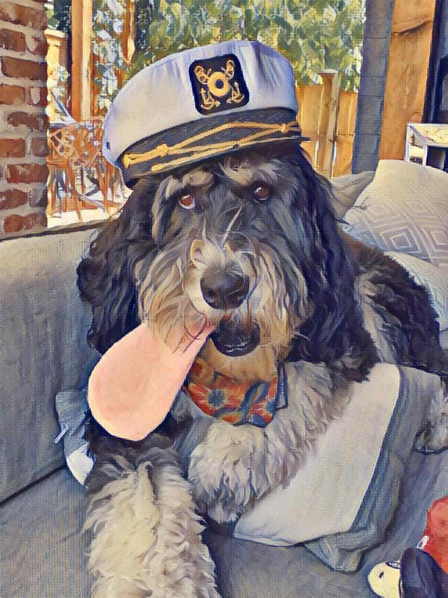 Painting of a dog wearing a captain`s hat and bandana, tongue out.