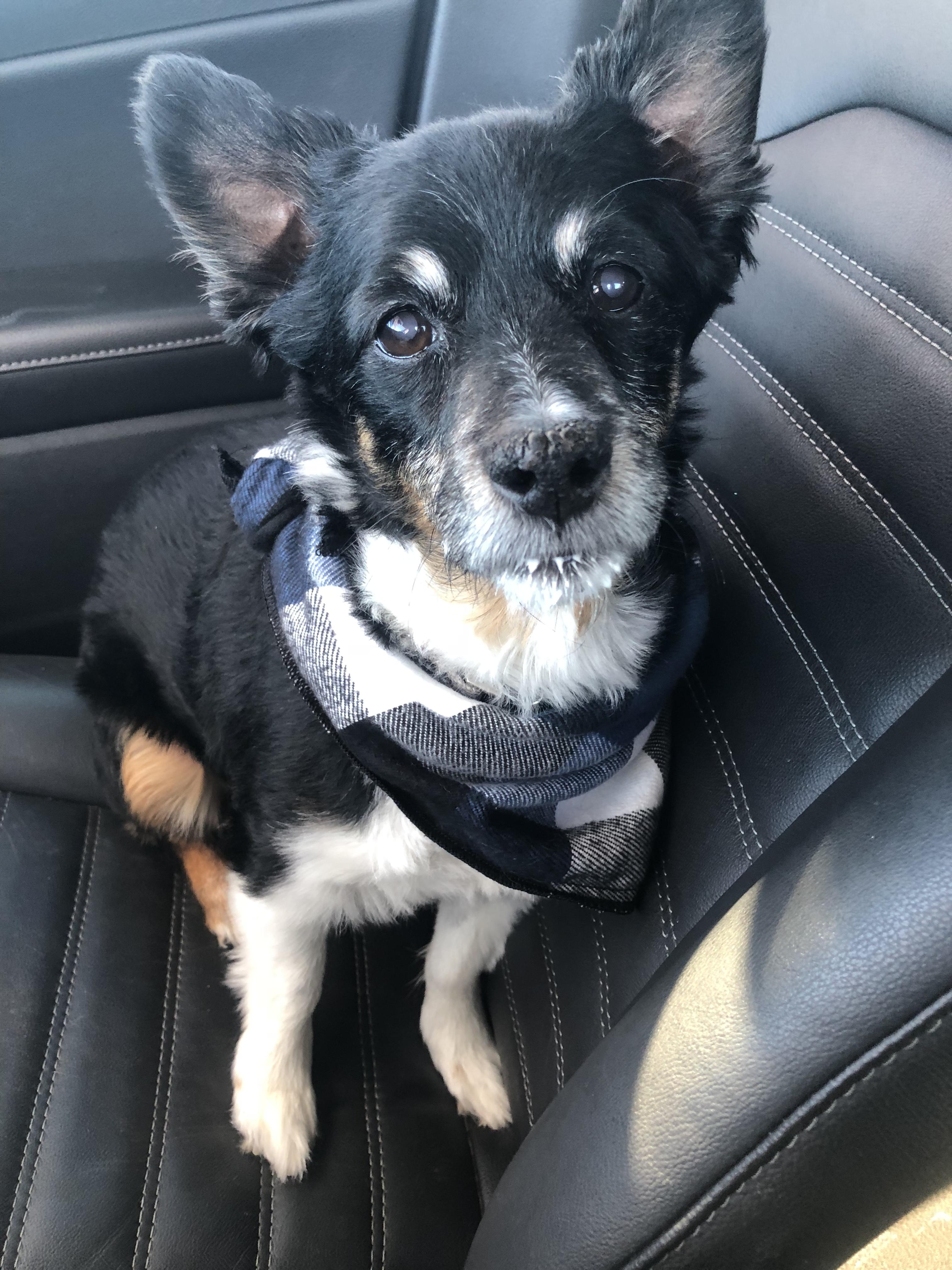 Painted portrait of a small, black and white dog wearing a blue scarf, standing in grass.
