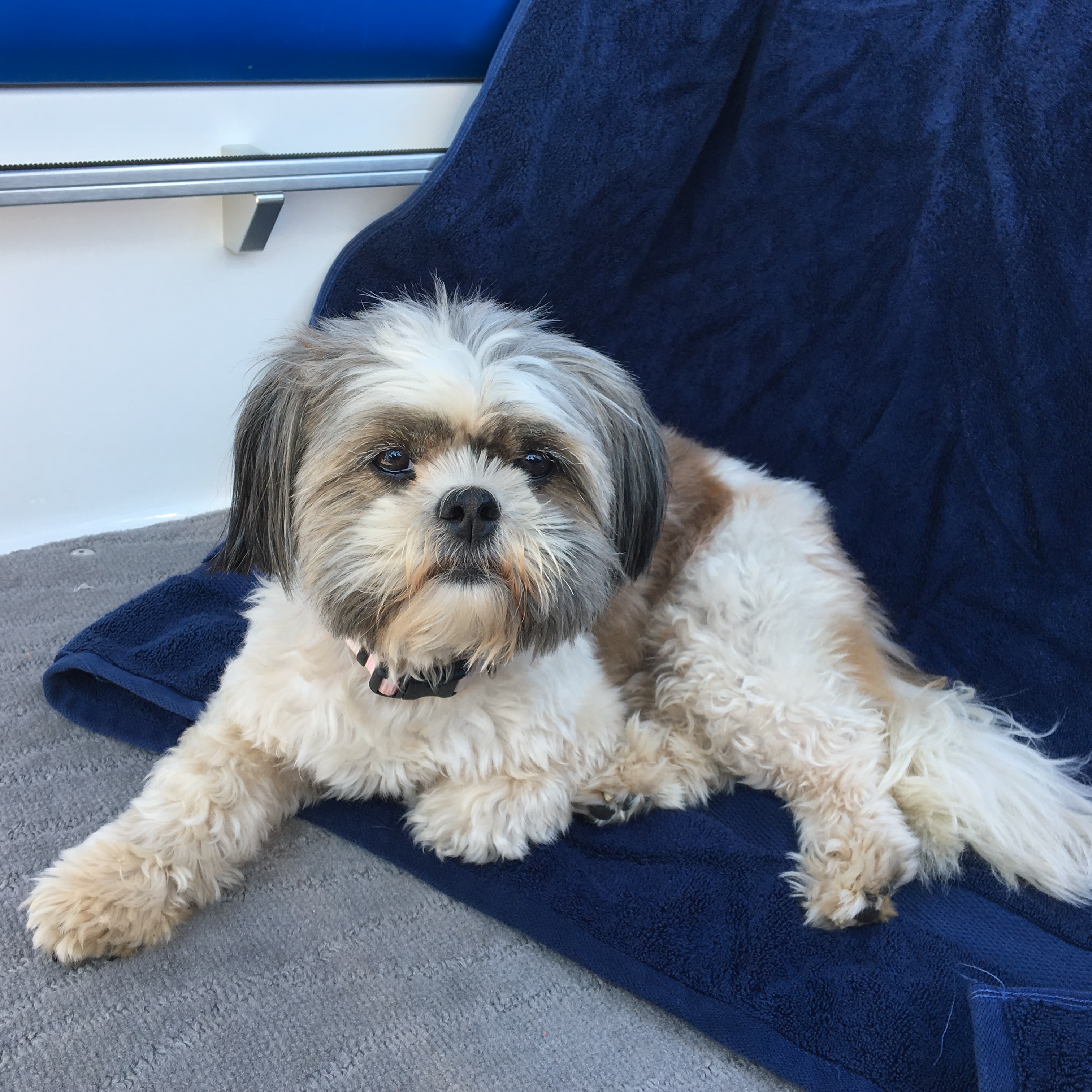 Painting of a Shih Tzu dog lying on green grass next to a tennis ball.