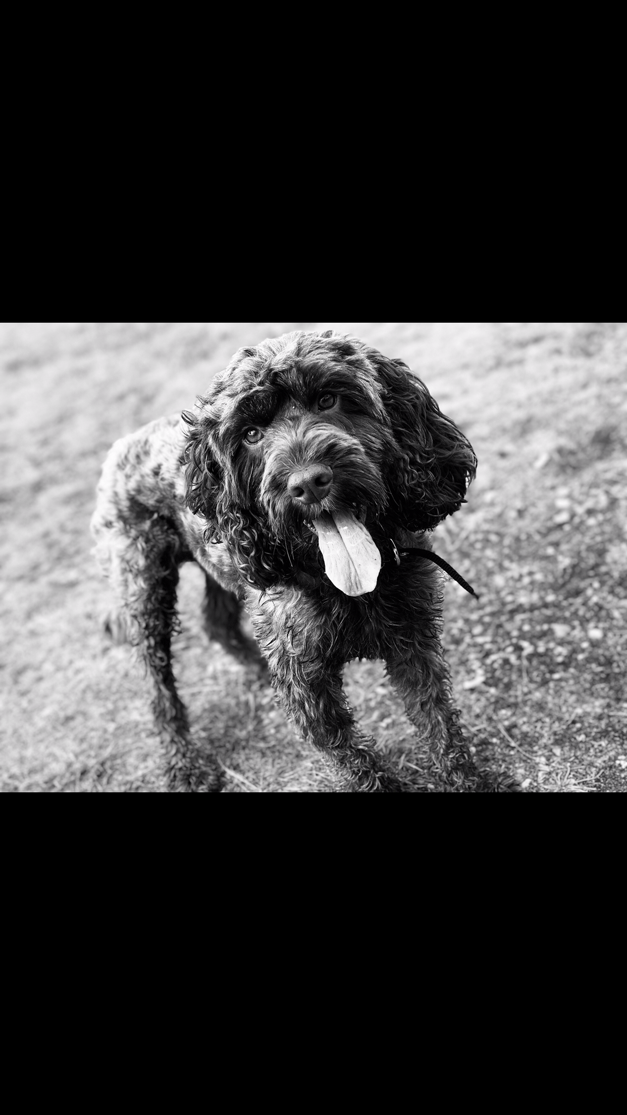 Black and white painting of a happy dog with its tongue out.