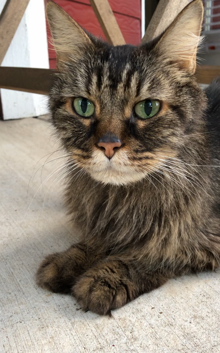 Painting of Pookie, a long-haired tabby cat with green eyes.