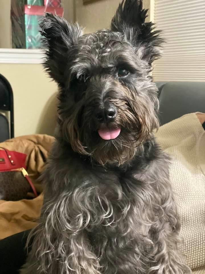 Painting of a gray and black schnauzer with its tongue out, against a yellow and green background.