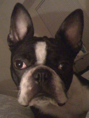 Painting of a Boston Terrier wearing a purple collar