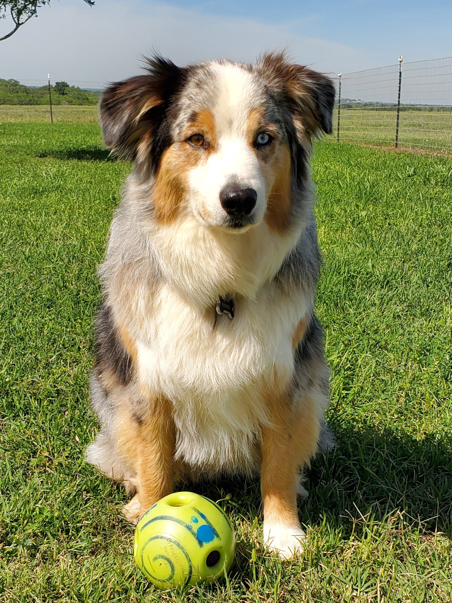 Painting of an Australian Shepherd sitting in grass with a green ball.