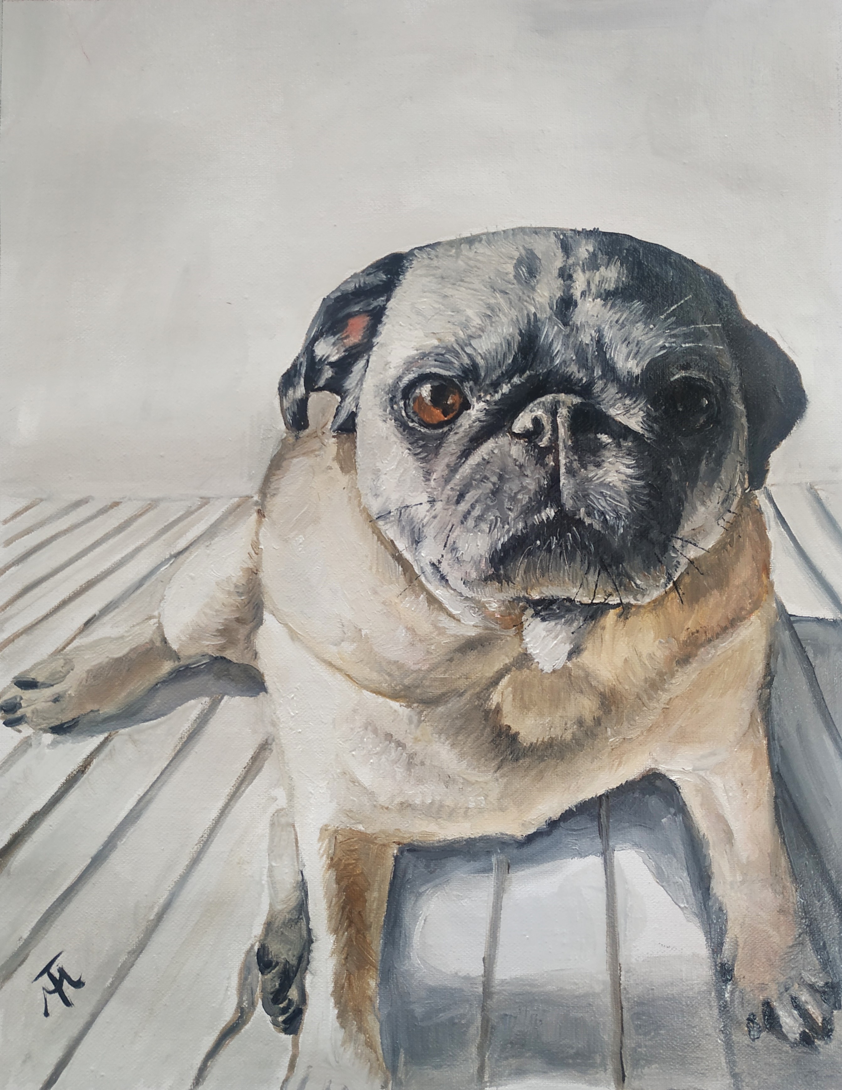 Painting of a pug sitting on a deck.