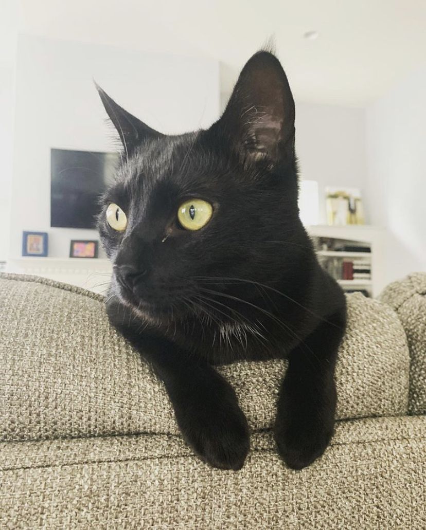 Painting of a black cat with bright yellow eyes resting on a tan couch.