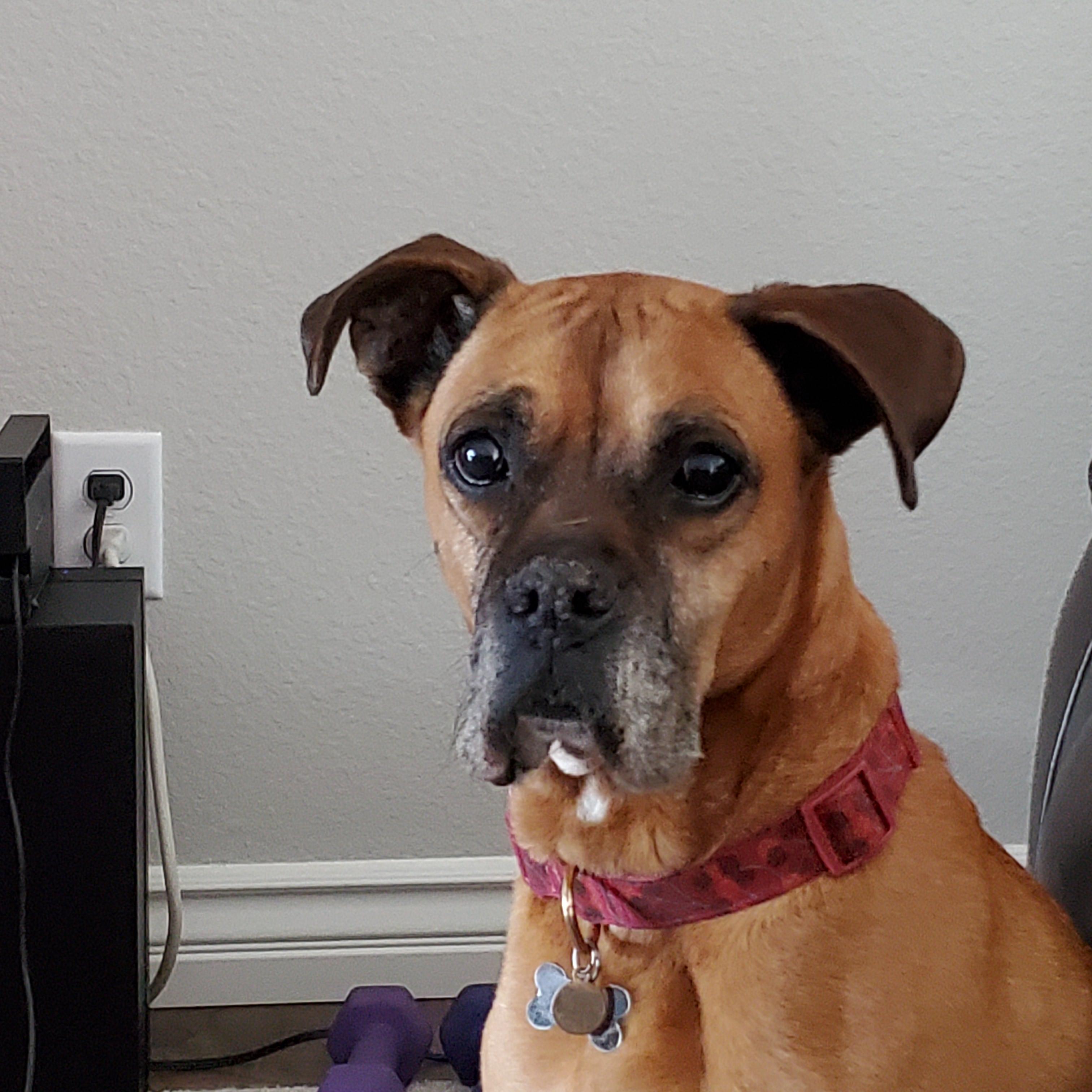 Painting of a fawn boxer dog named Lucy wearing a red collar.