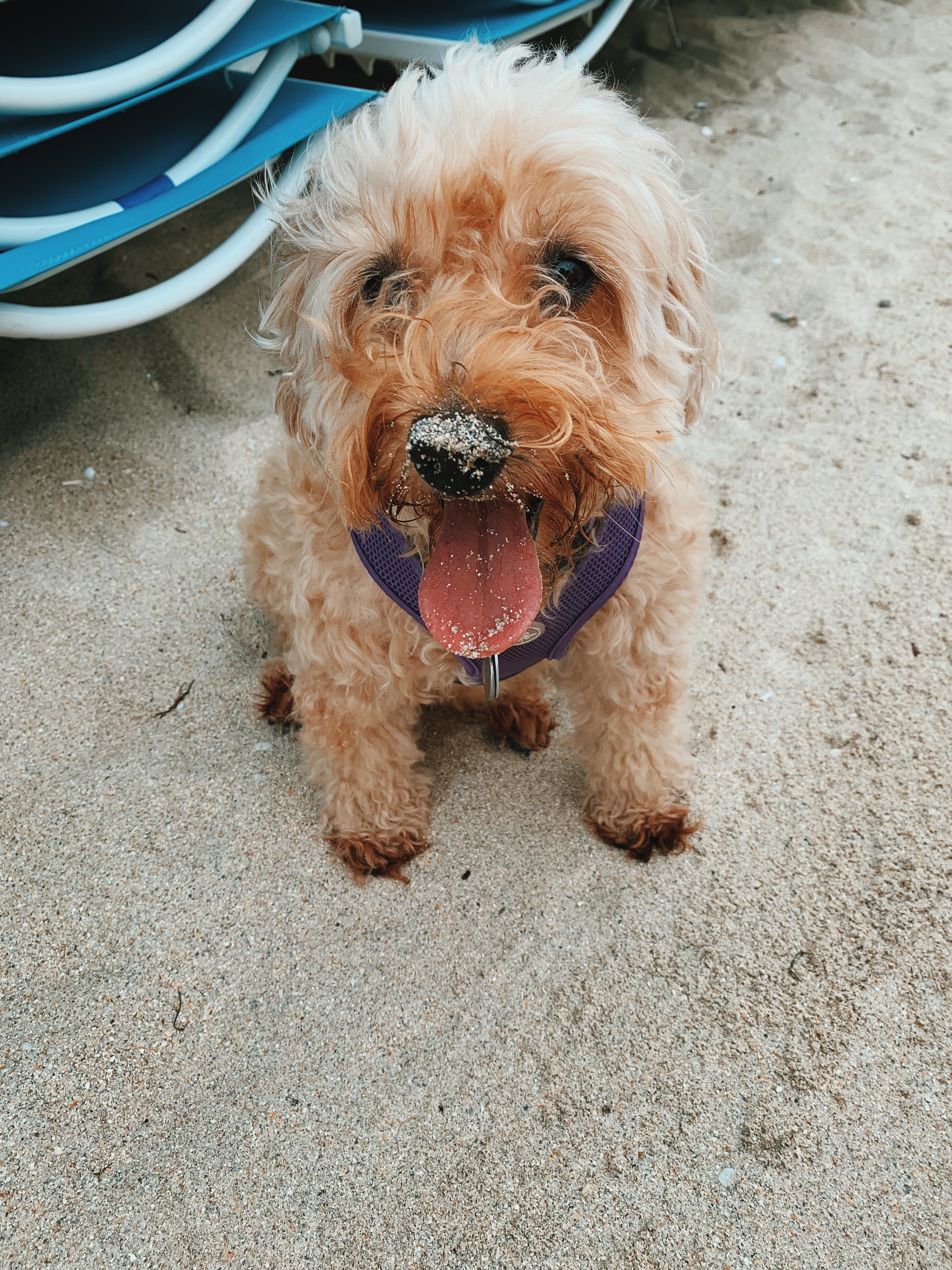 Painting of a fluffy brown dog on a beach at sunset.