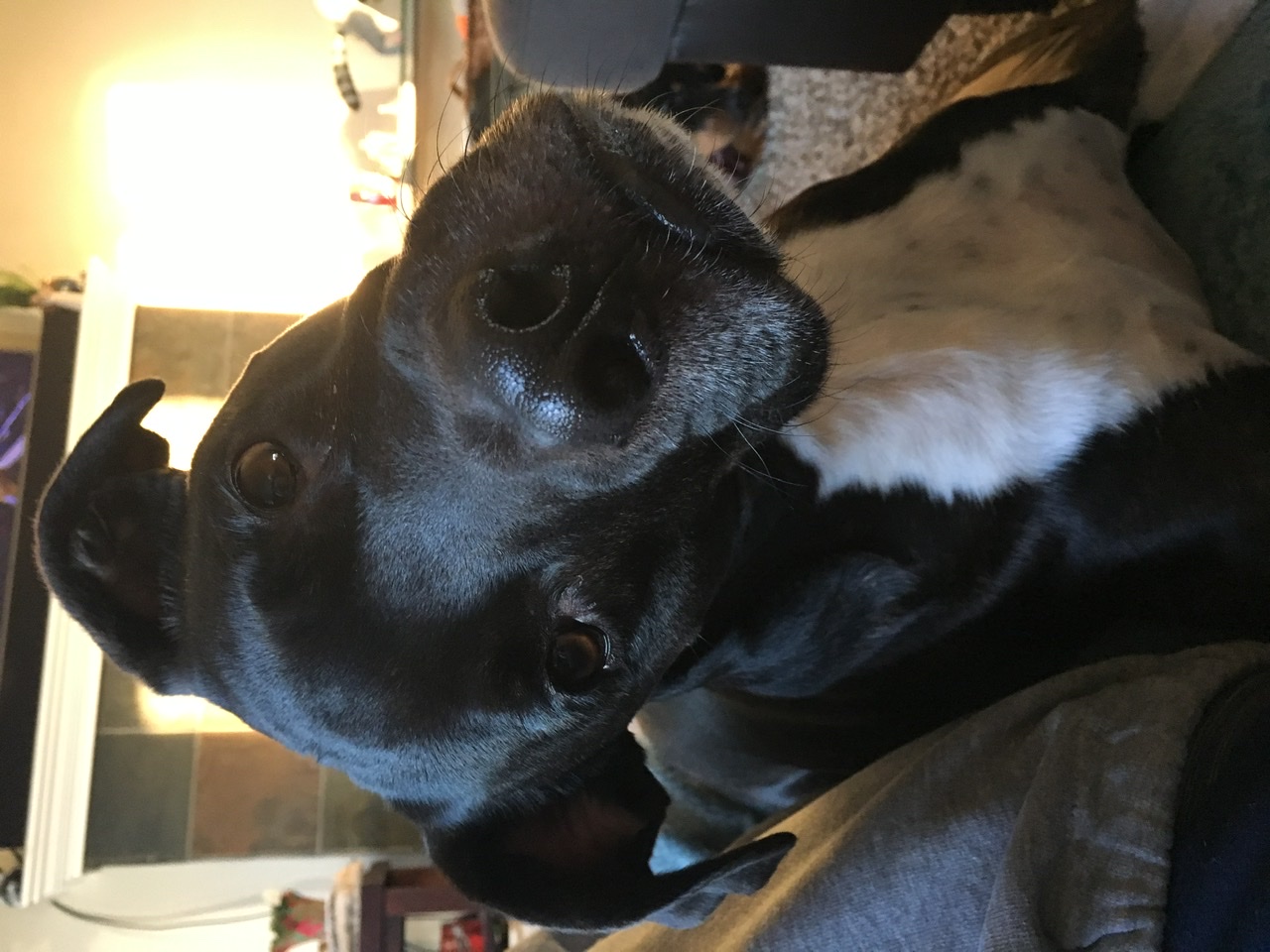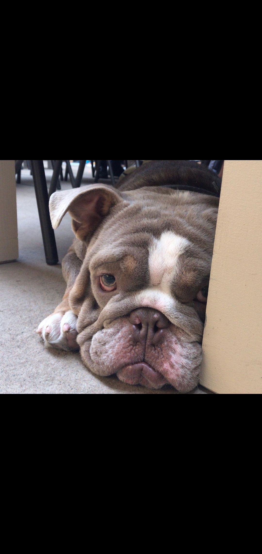 Painting of a gray and white bulldog lying down, looking at the viewer.