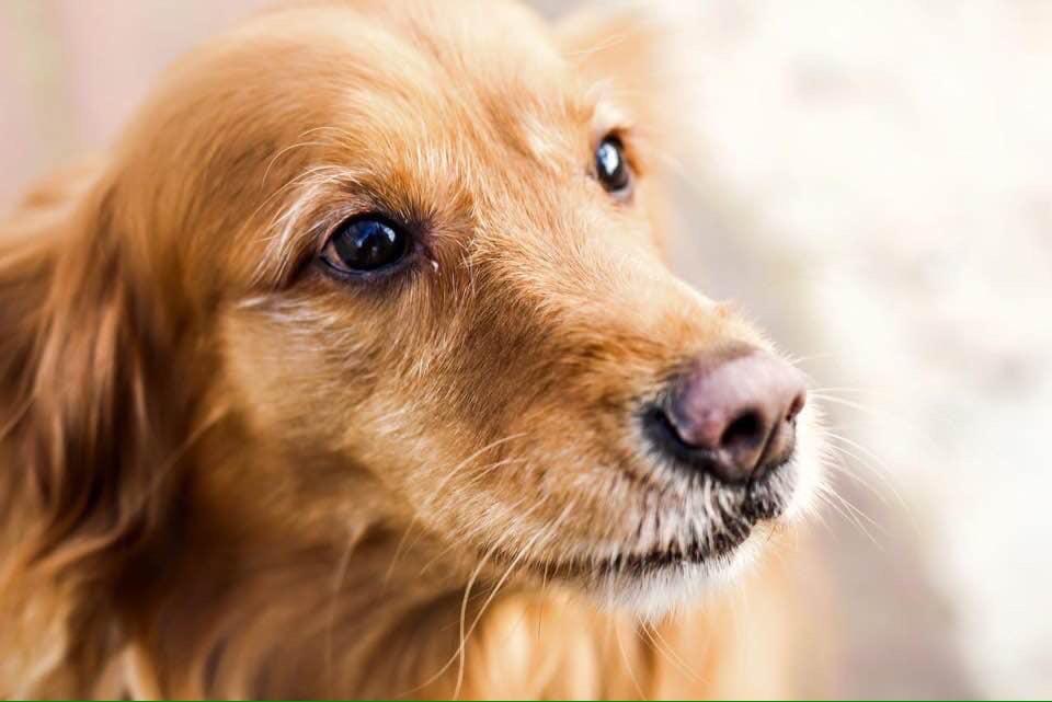 Painting of a golden retriever looking to the right.