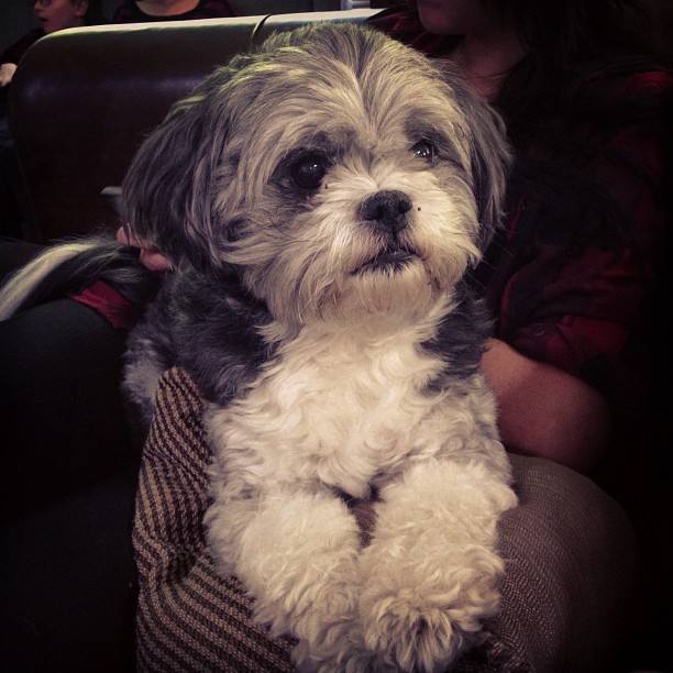 Oil painting of a fluffy dog in a blanket.