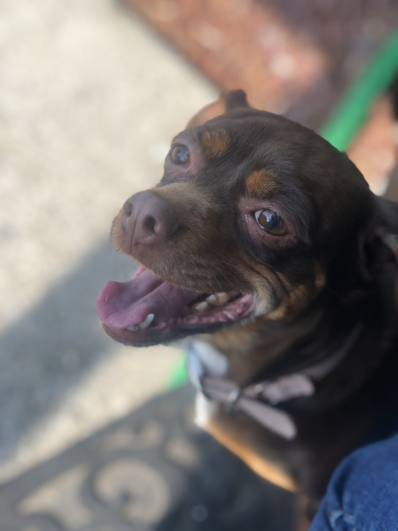 Painting of a dog with its tongue out against a blue and white background.