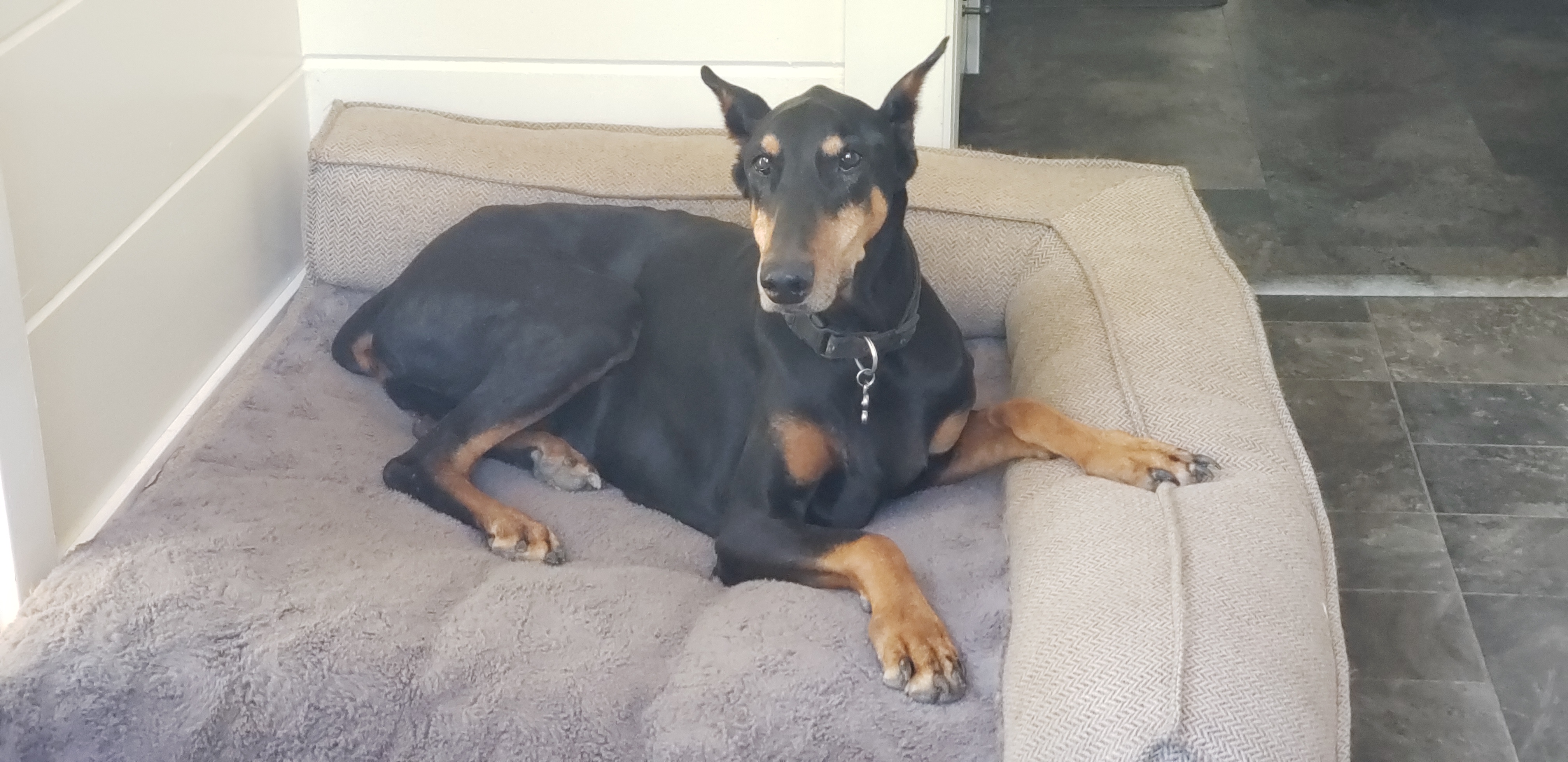 Painting of a Doberman Pinscher`s head and shoulders.