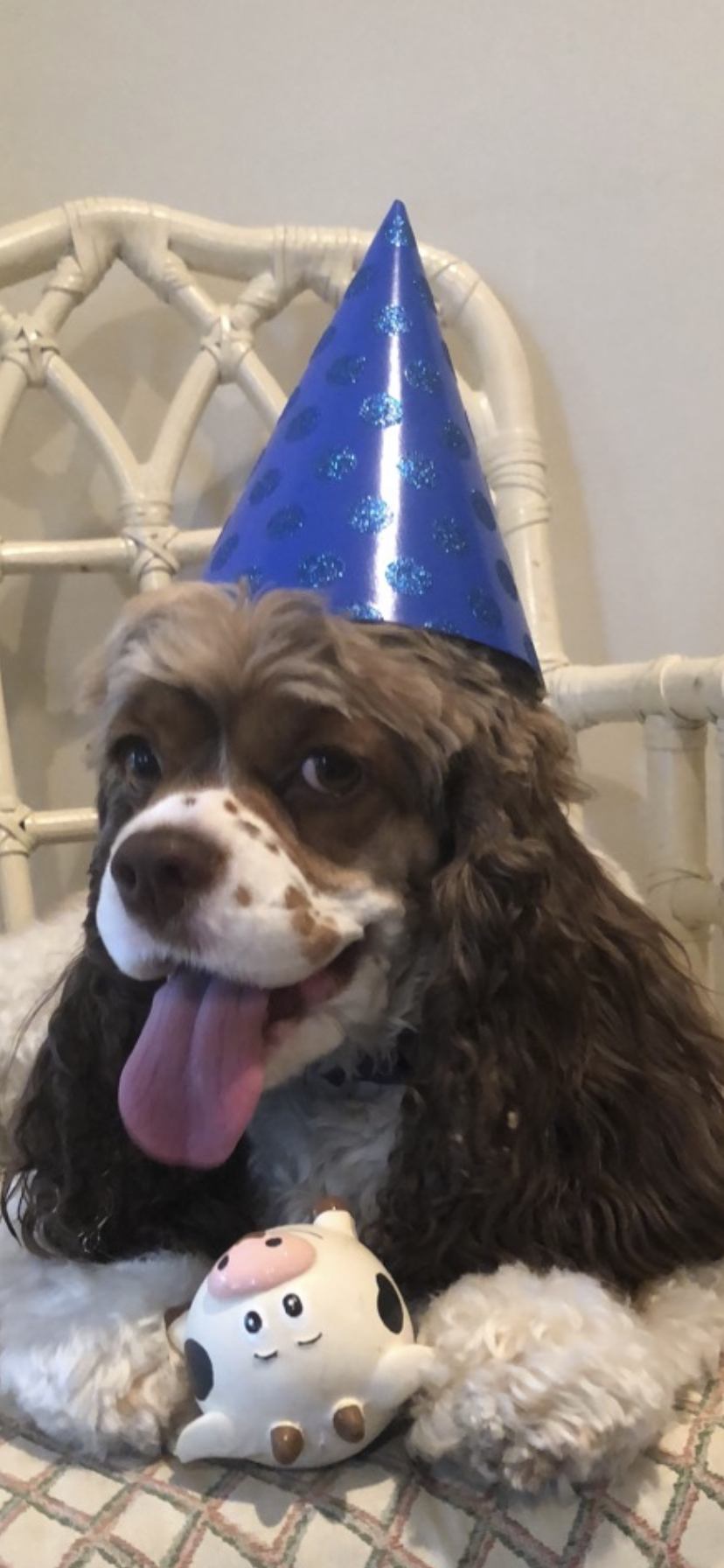 Painting of a brown and white Cocker Spaniel holding a toy pig.