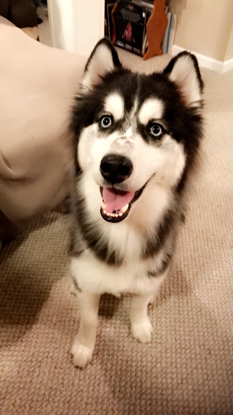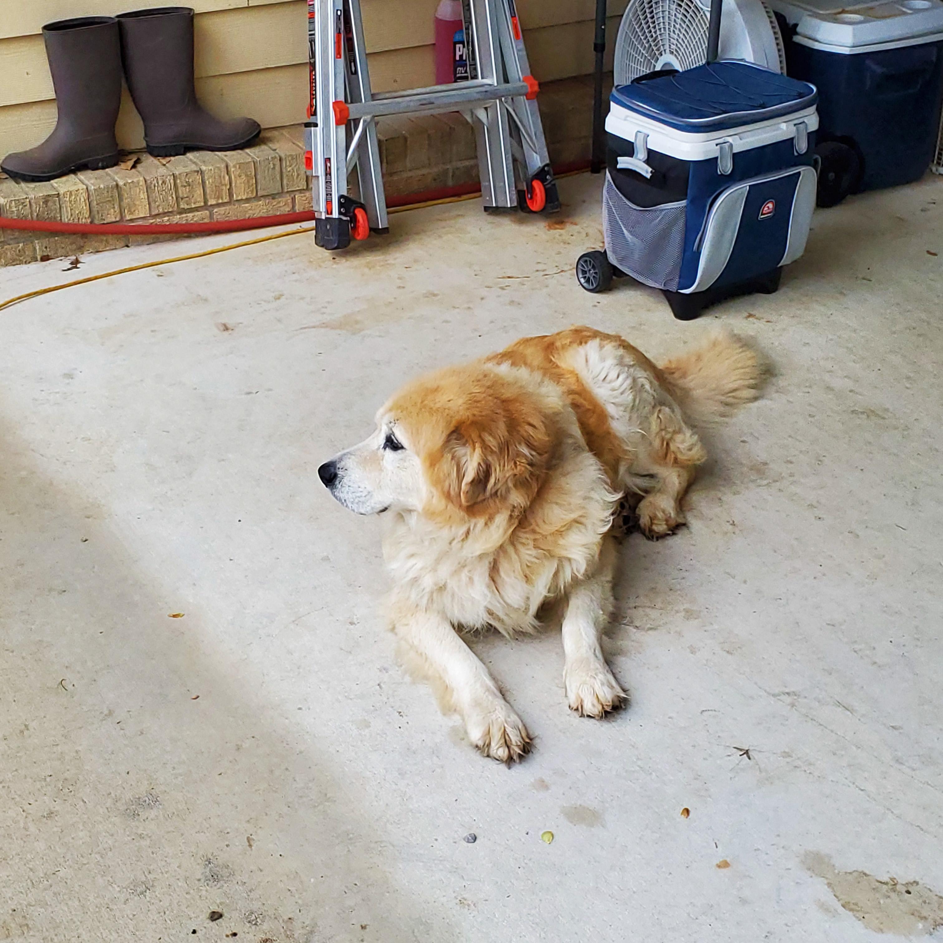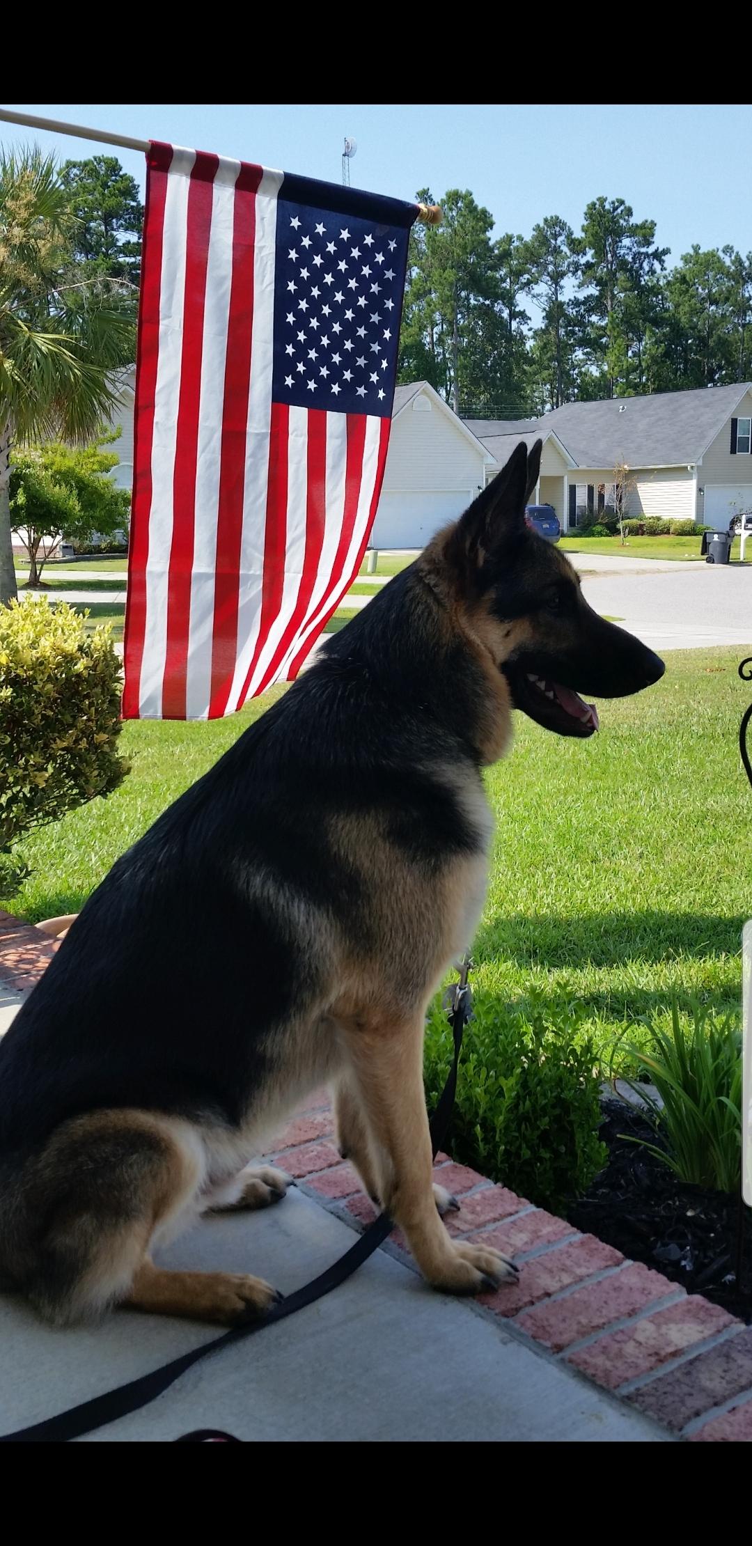 Painting of a German Shepherd sitting on a porch, next to an American flag.