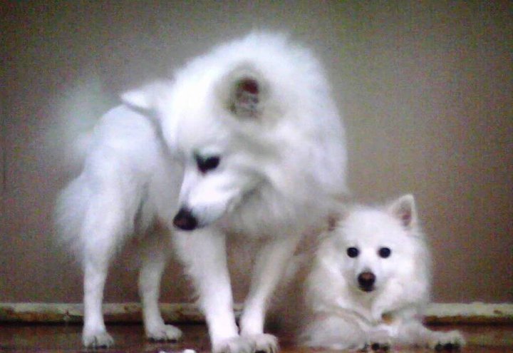 Painting of a pit bull with an orange collar looking towards a lake and trees
