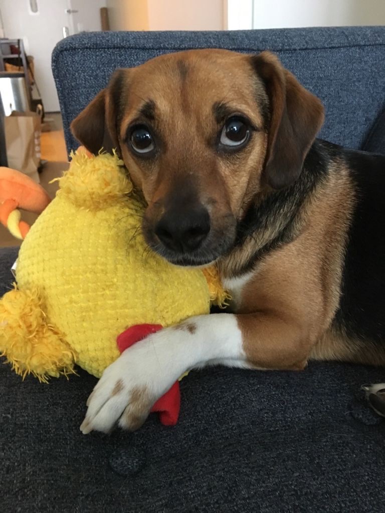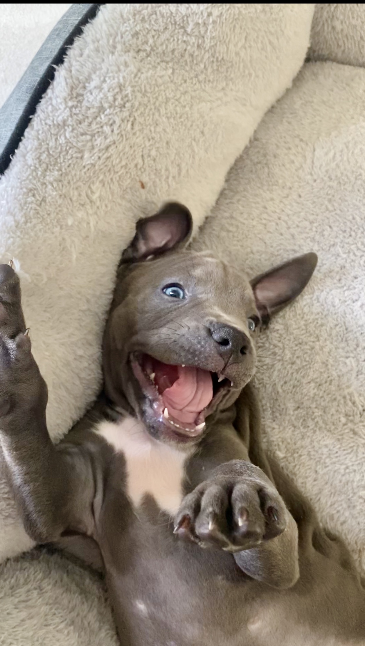 Painting of a gray puppy lying on its back in the grass with its mouth open and tongue out.