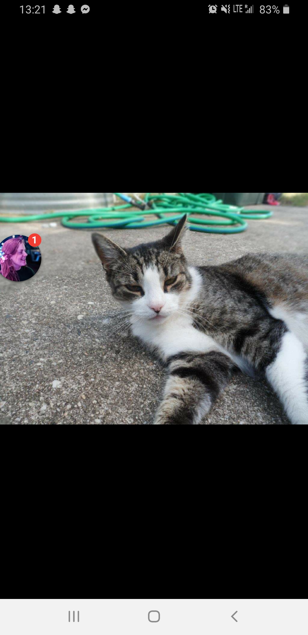 Grey and white tabby cat resting on a wooden deck, garden background.