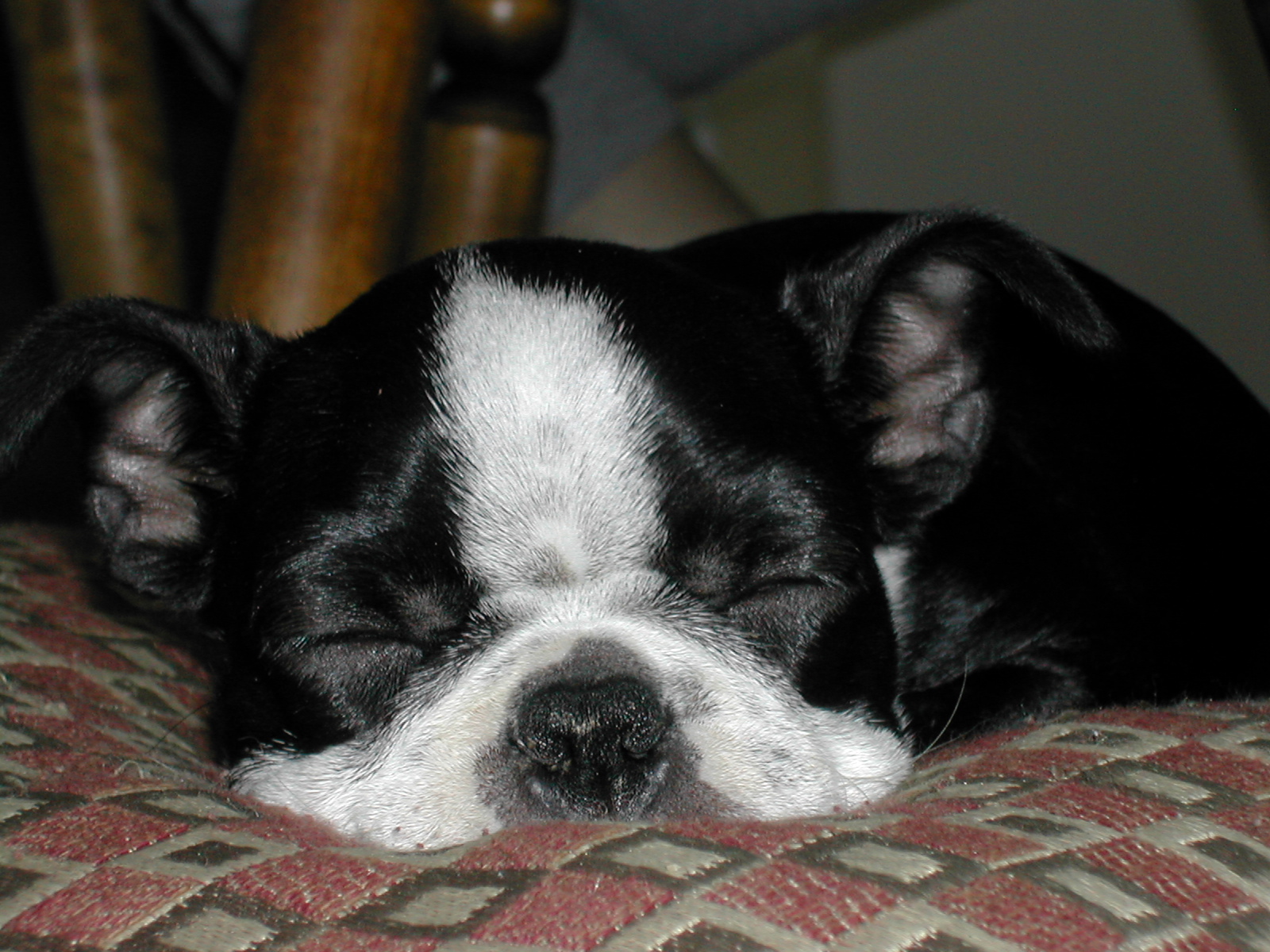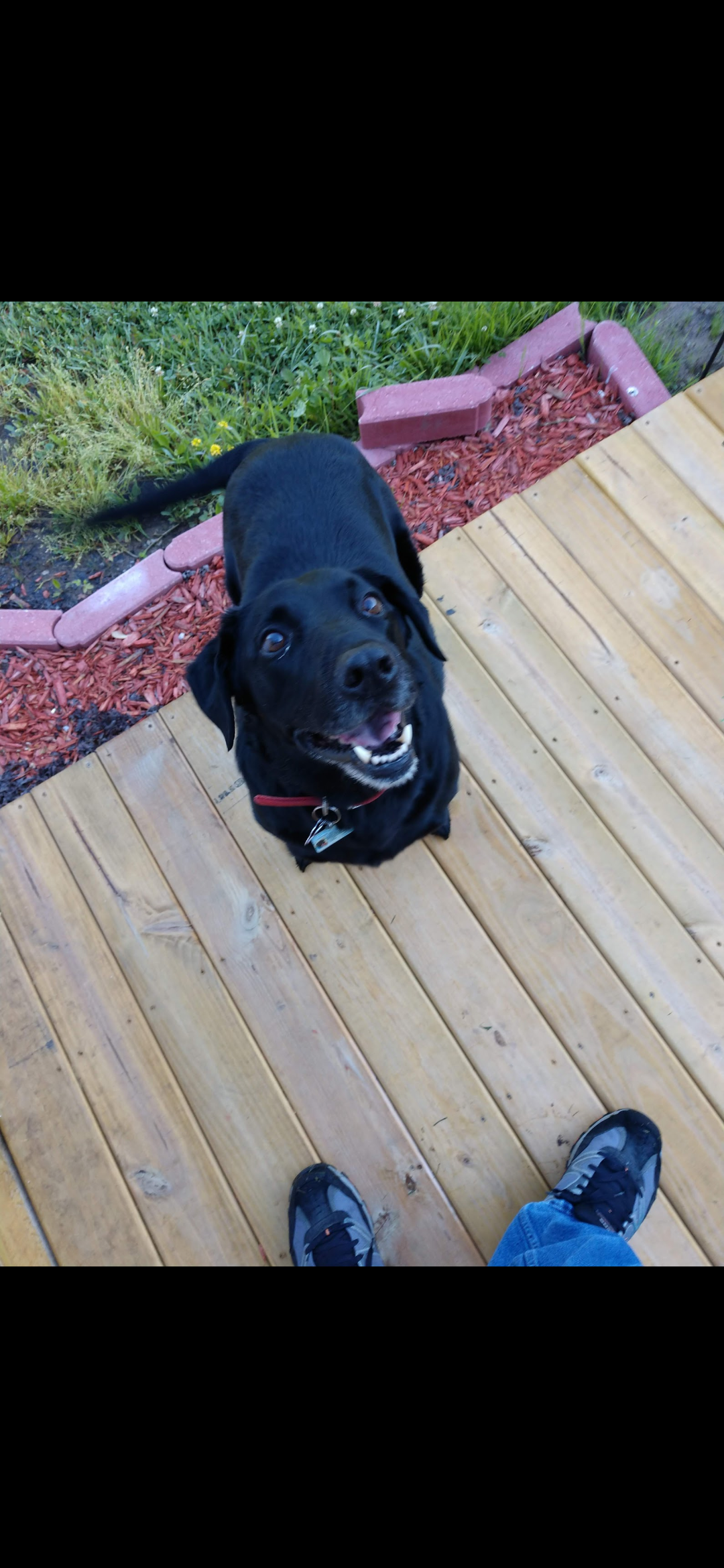 Painting of a black dog with its tongue out wearing a red collar and tag