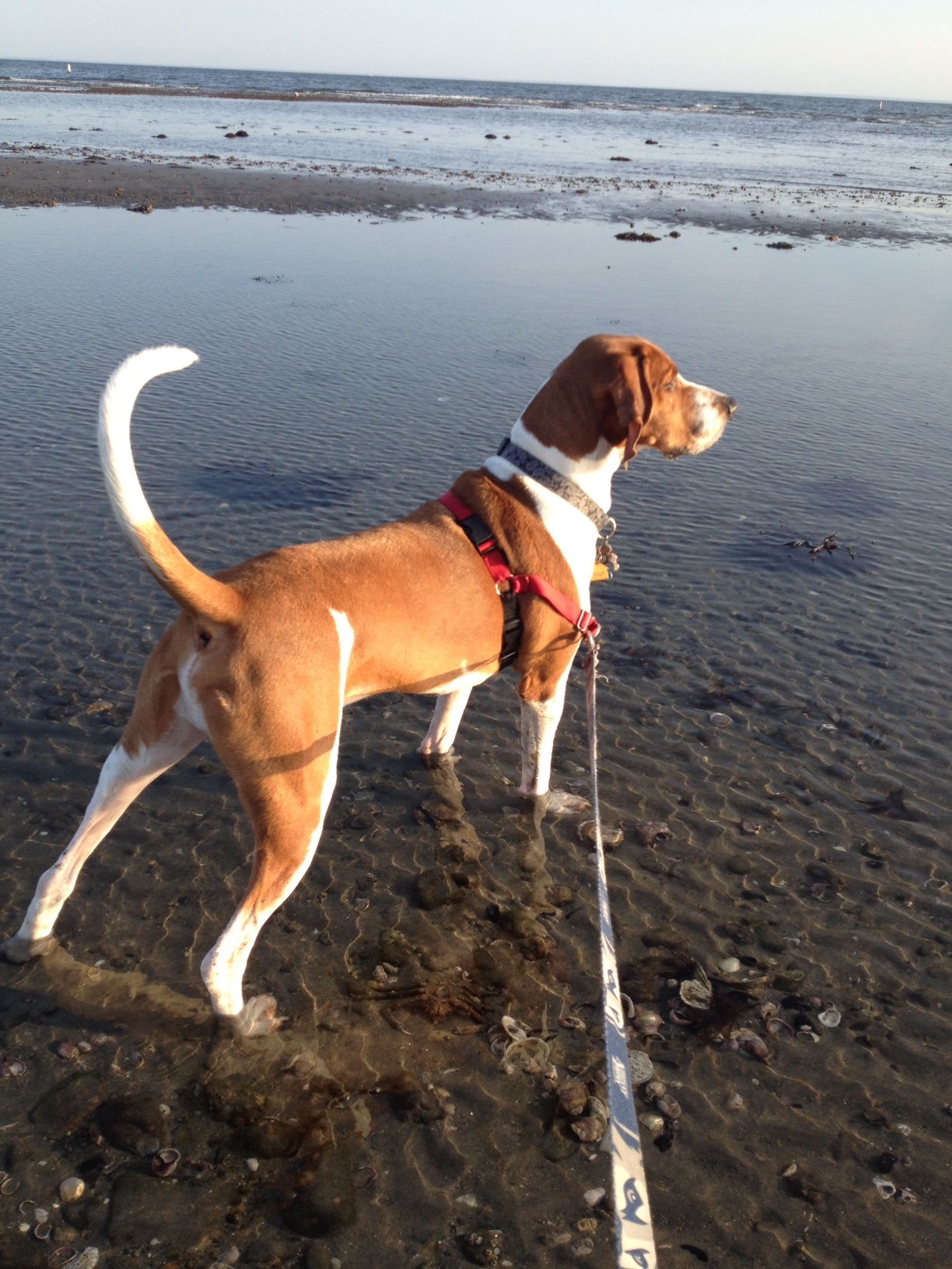 Painting of a brown and white dog standing in shallow water, looking to the right.