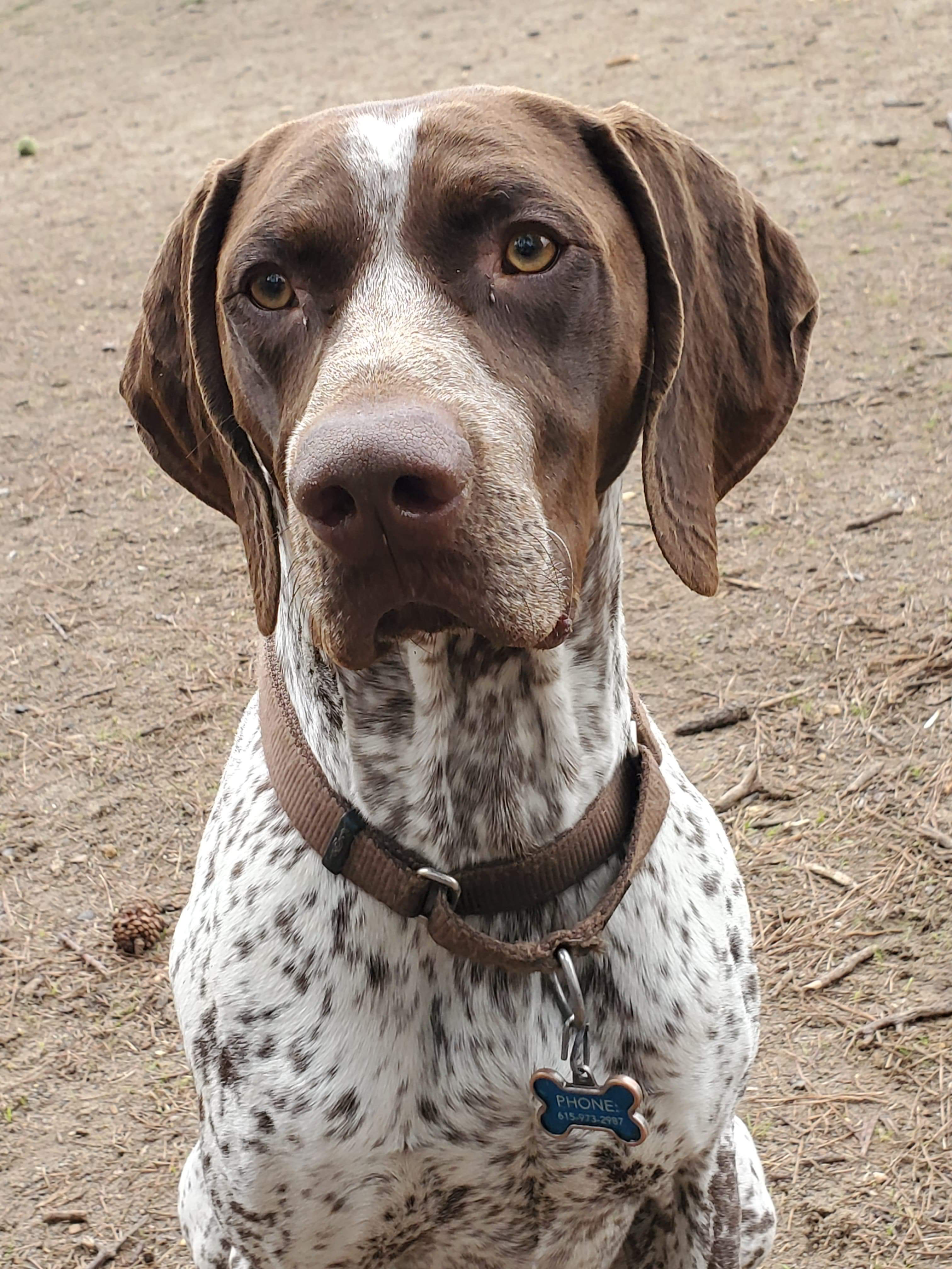 Painting of a German Shorthaired Pointer named Milo wearing a brown collar.