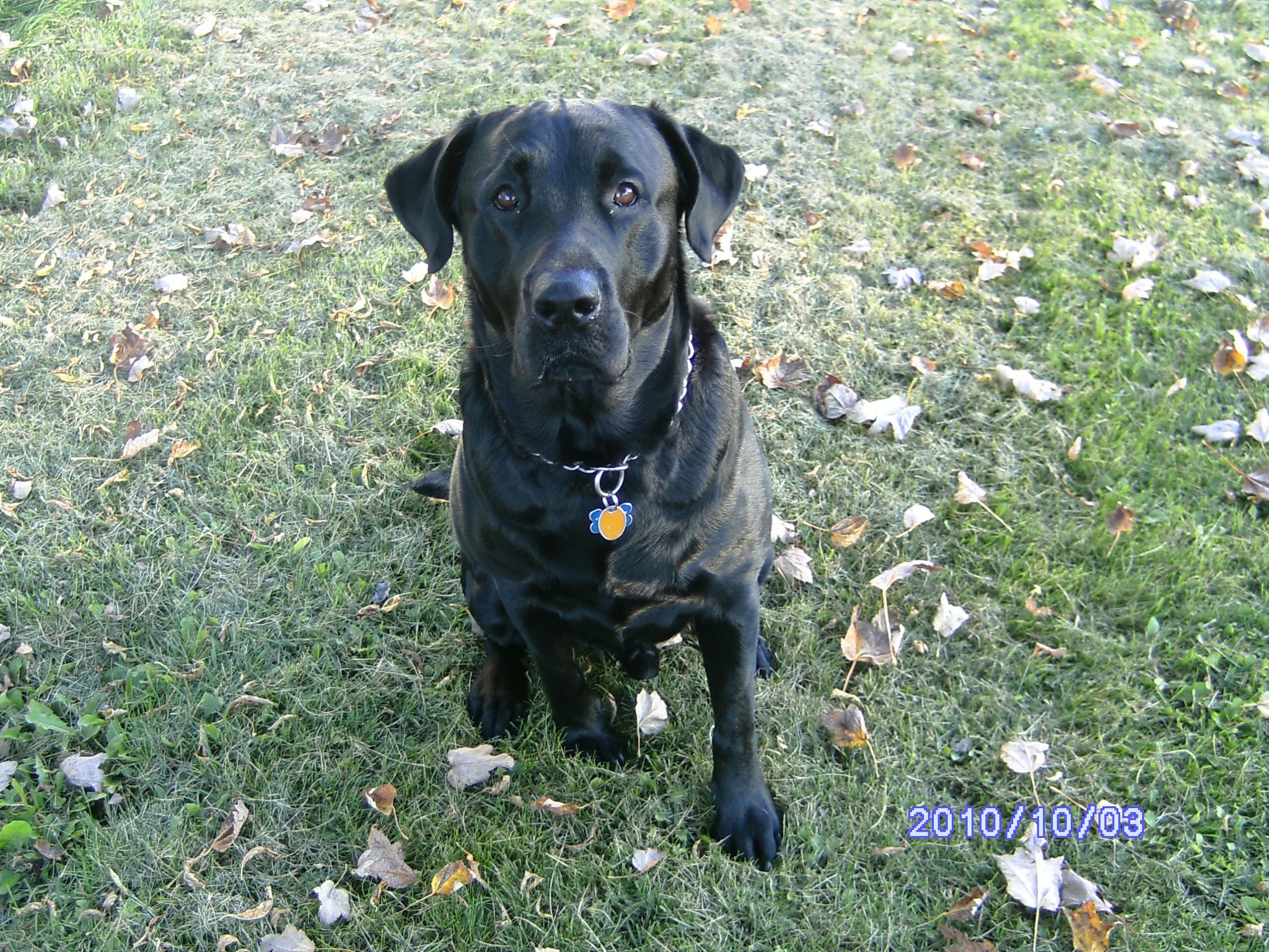 Painting of a black Labrador Retriever sitting in grass.