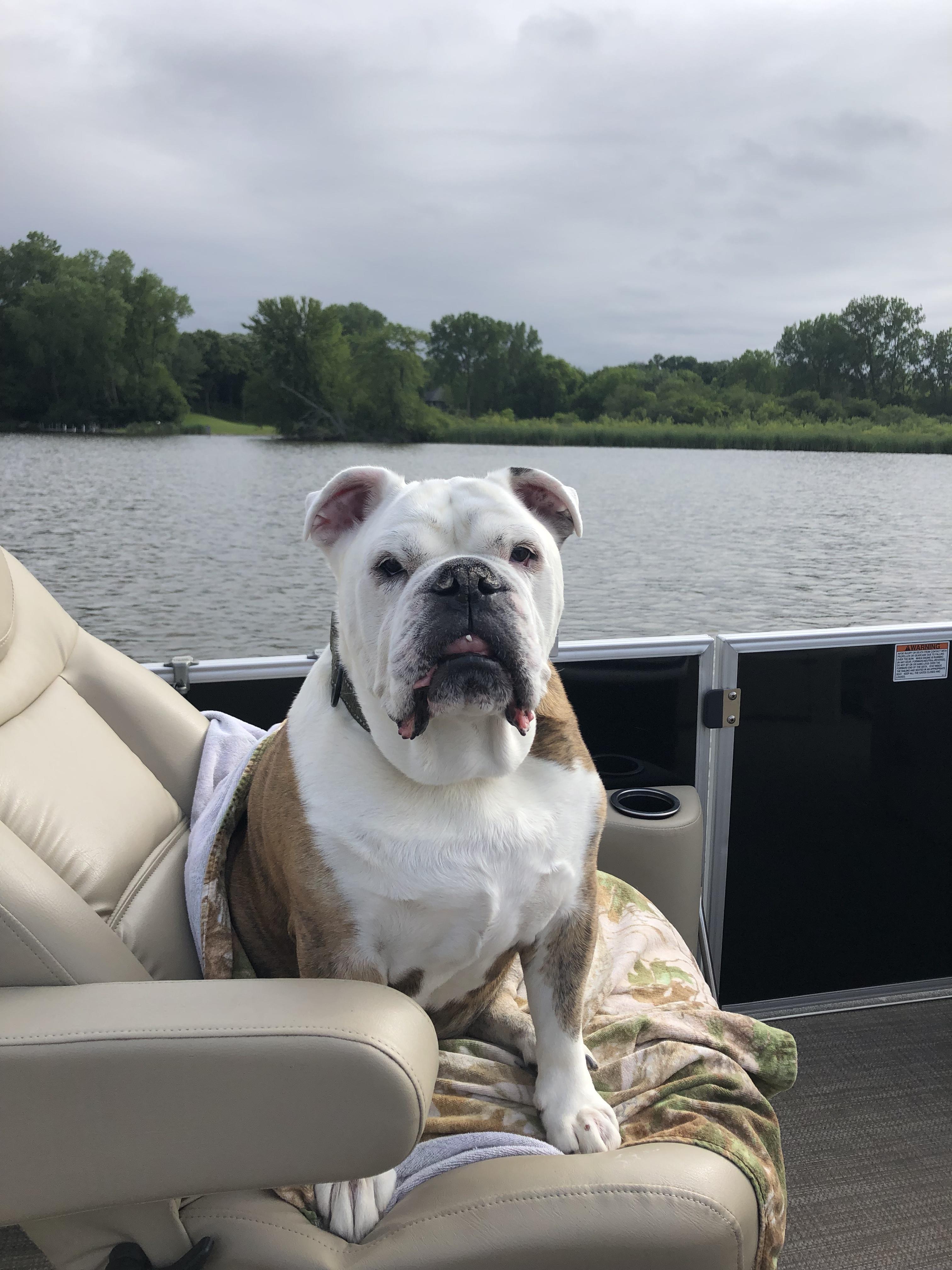 Painting of a white and tan bulldog sitting outdoors by water.