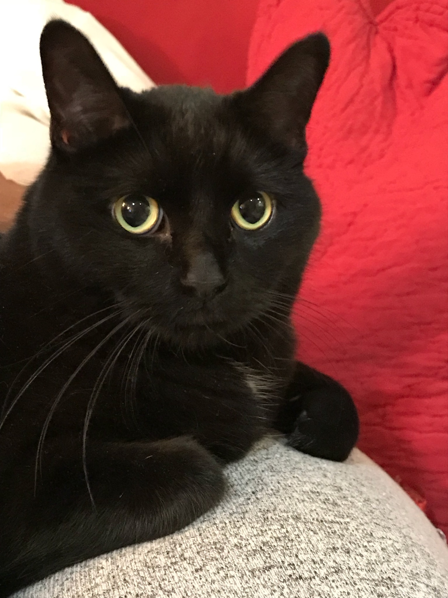 Painting of a black cat with bright yellow eyes.