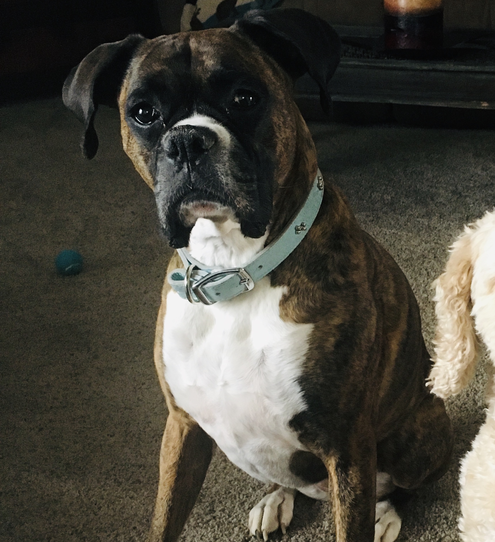 Black and white drawing of a Boxer dog wearing a collar.