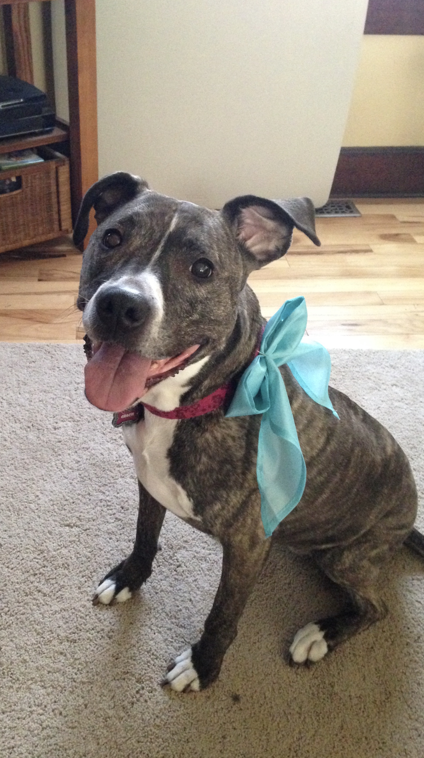 Painting of a smiling black and white dog wearing a purple bow and a collar with a Gracie tag.